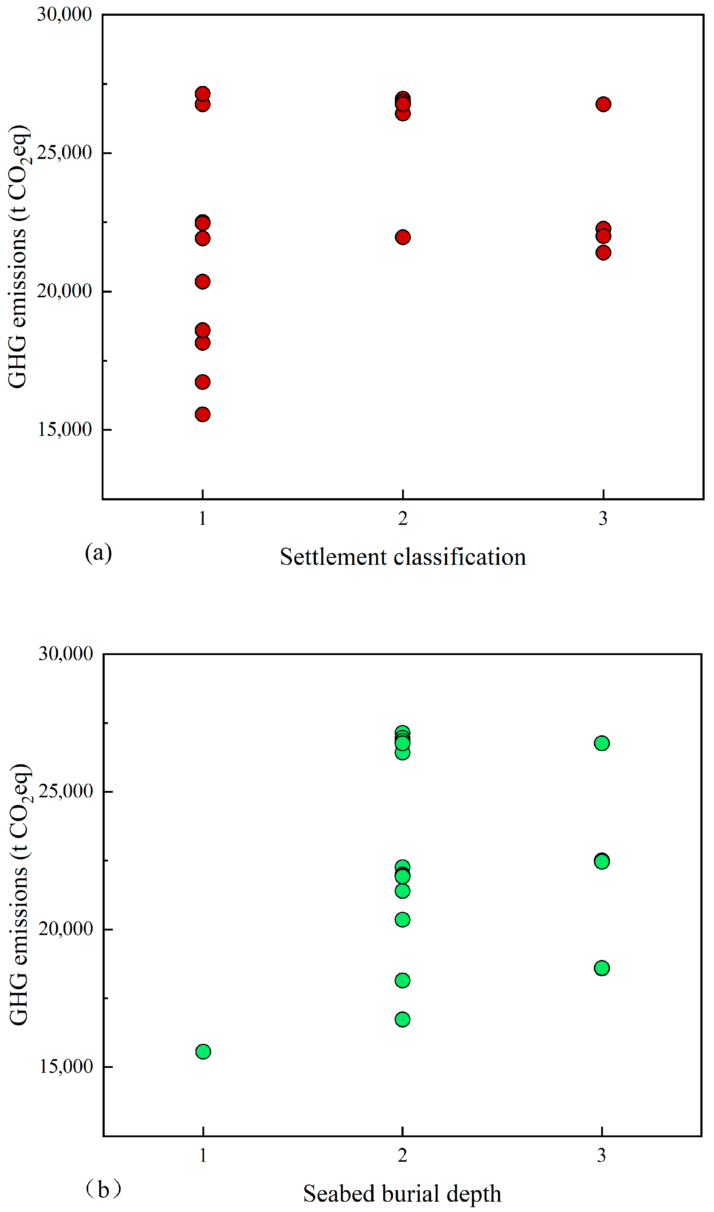 Figure 4. GHG emissions with different classifications. (a) Settlement classification, and (b) buried depth below the seabed.