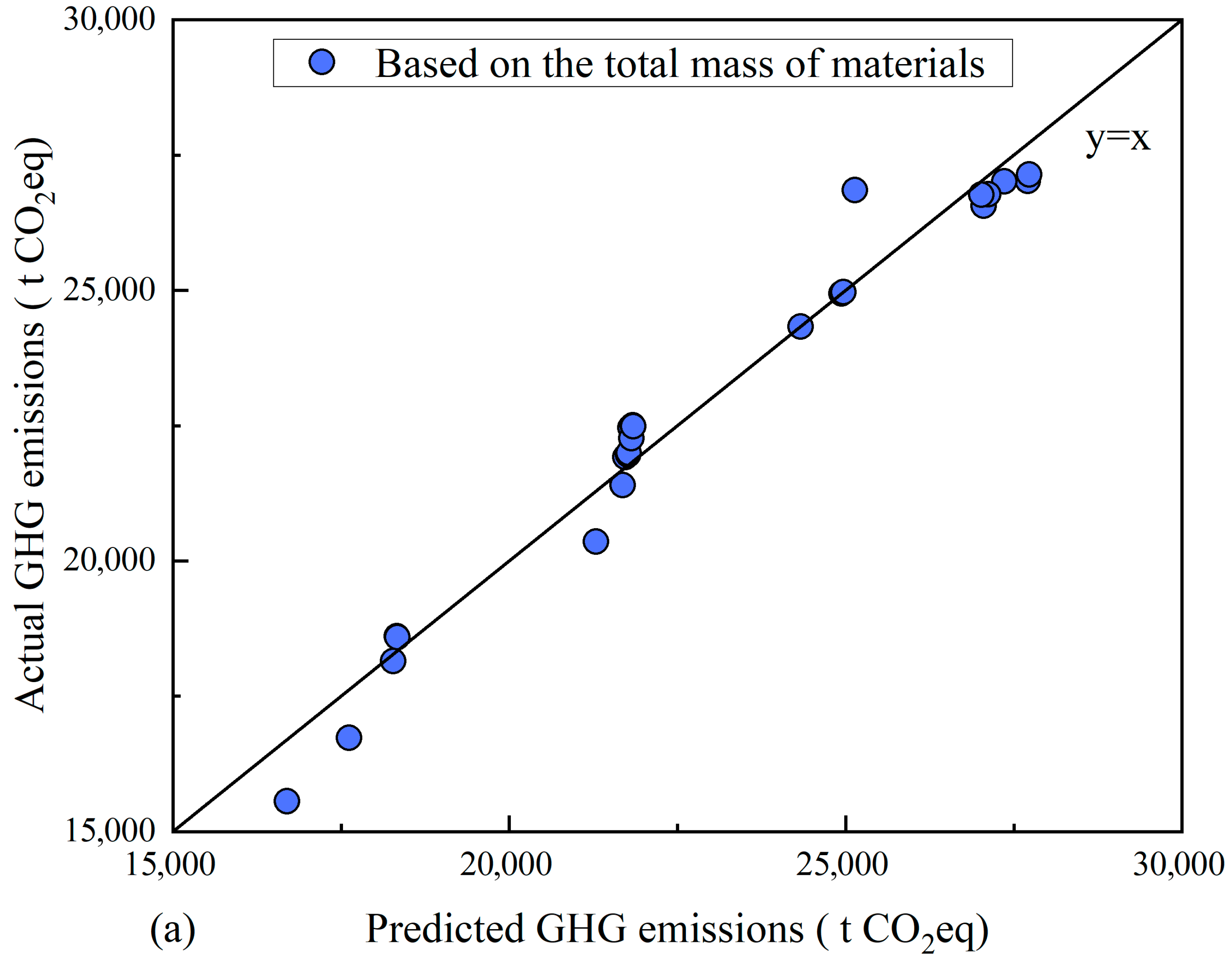 As can be seen from Table 7, the univariate model using total material mass provides the best balance between accuracy and data availability (GHG = 0.346M + 1937.143, Adj. R2 = 0.961), while the volume-based model also performs well when material quantities are not yet available (GHG = 1.019V + 271.210, Adj. R2 = 0.959). Therefore, these two equations are recommended as design-stage prediction formulas for rapid estimation of construction-stage GHG emissions of immersed-tube segments.