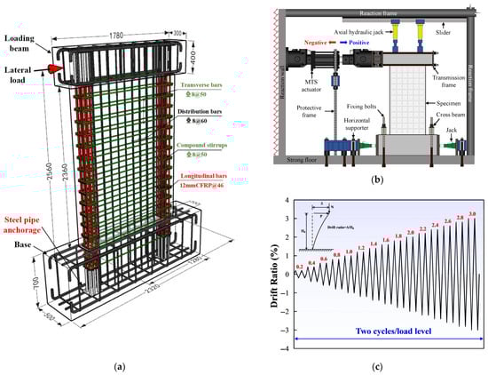 Experimental overview: (a) Dimension and reinforcement configurations; (b) Loading schematic diagram; (c) Loading procedure.