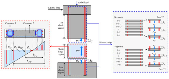 - The strain and stress of CFRP bars displayed even distribution in the plastic hinge area. This assumption is based on two core mechanical characteristics: first, CFRP bars exhibit linear-elastic behavior without yielding or plastic deformation, meaning their stress–strain relationship remains linear under cyclic loading; second, the uniform curvature distribution assumed in assumption (1) leads to linear strain distribution along the cross-section, and the consistent bond behavior ensures that CFRP bars do not experience significant stress gradients within the plastic hinge zone. This simplification is necessary to streamline the stress calculation of FRP bars in the discrete spring framework.