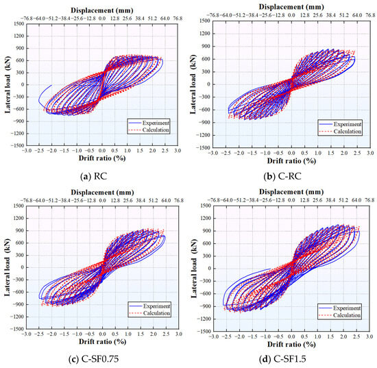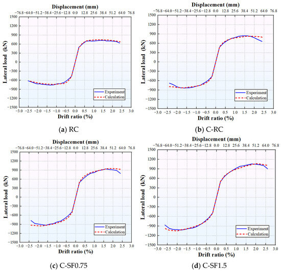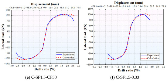 Specifically, a comparison of Figure 9b–d reveals that the calculated results follow the same variation trend as the experimental results: both the peak load and peak drift increase with the rise in VF. For example, compared with Specimen C-RC, the calculated peak loads of Specimens C-SF0.75 and C-SF1.5 increase by 19.70% and 30.28%, respectively, and the corresponding peak drift ratios increase by 12.5% and 25.0%, respectively. In addition to VF, both the peak load and peak drift ratio increase with the enhancement of concrete strength. For instance, the calculated peak load of Specimen C-SF1.5-CF50 is 18.53% higher than that of Specimen C-SF1.5, and the corresponding peak drift ratio increases by 10.0%. In contrast, the axial compression ratio shows an opposite effect on the peak drift while promoting the peak load. As an illustration, compared with Specimen C-SF1.5, the calculated peak load of Specimen C-SF1.5-0.33 increases by 26.49%, and the corresponding peak drift ratio decreases by 30.0%.