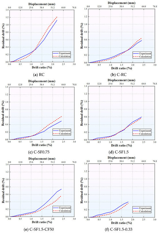 The calculated and experimental residual displacements are illustrated in Figure 10, with corresponding values listed in Table 4. It is evident that the calculated results are in good overall consistency with the experimental data. First, Figure 10a,b reveal that the proposed numerical model is capable of capturing the effects of the linear elastic behavior of CFRP bars on the residual deformation of the specimens. For instance, at a drift of 1.8%, the calculated residual displacement of Specimen C-RC is reduced by 63.44% compared with that of Specimen RC, demonstrating a favorable self-centering capacity. Second, with the increase in the VF, the calculated residual displacement exhibits a slight upward trend, yet still maintains a superior self-centering performance relative to Specimen RC. As an illustration, at a drift of 1.8%, the calculated residual displacements of Specimens C-SF0.75 and C-SF1.5 are reduced by 58.06% and 61.29%, respectively, compared with that of Specimen RC. With the increase in the axial compression ratio, the calculated residual displacement of the specimens increases, which is consistent with the variation trend reflected by the experimental results. For example, at a drift of 1.8%, the calculated residual displacement of Specimen C-SF1.5-0.33 is 8.33% lower than that of Specimen C-SF1.5. In contrast, increasing the concrete strength exerts a negligible influence on the calculated residual displacement of the specimens.