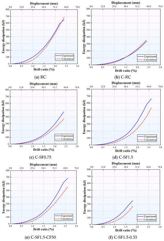 The energy dissipation was calculated by numerically integrating the enclosed area of the measured hysteretic curves for each loading cycle, with cumulative energy dissipation (CED) obtained by summing the energy dissipation of all cycles. The calculated and experimental CED of the specimens are illustrated in Figure 11, with corresponding values listed in Table 5. As can be seen, the simulation results for RC and C-RC specimens match well with the experimental results, with a maximum error controlled within 6%. This indicates that the proposed calculation method is capable of capturing the phenomenon of reduced energy dissipation. For instance, compared with the Specimen RC, the calculated CED of the Specimen C-RC decreases by 47.51%, which is consistent with the experimental findings. However, increasing the VF, the calculated CED is consistently lower than the experimental results, accompanied by a gradual increase in the error margin. This discrepancy arises because the calculation method neglects the tensile strength of concrete, thereby failing to account for the additional energy dissipation enhancement contributed by the improved tensile strength and toughness of SFRC. In addition, when the concrete strength and axial compression ratio are varied, the calculated results exhibit the same trend as the experimental data: specifically, the CED increases with the rise in concrete strength and reduces with an increase in the axial compression ratio. As an illustration, in comparison with the Specimen C-SF1.5, the calculated CED of the Specimens C-SF1.5-CF50 and C-SF1.5-0.33 increases by 4.13% and decreases by 49.83%, respectively.