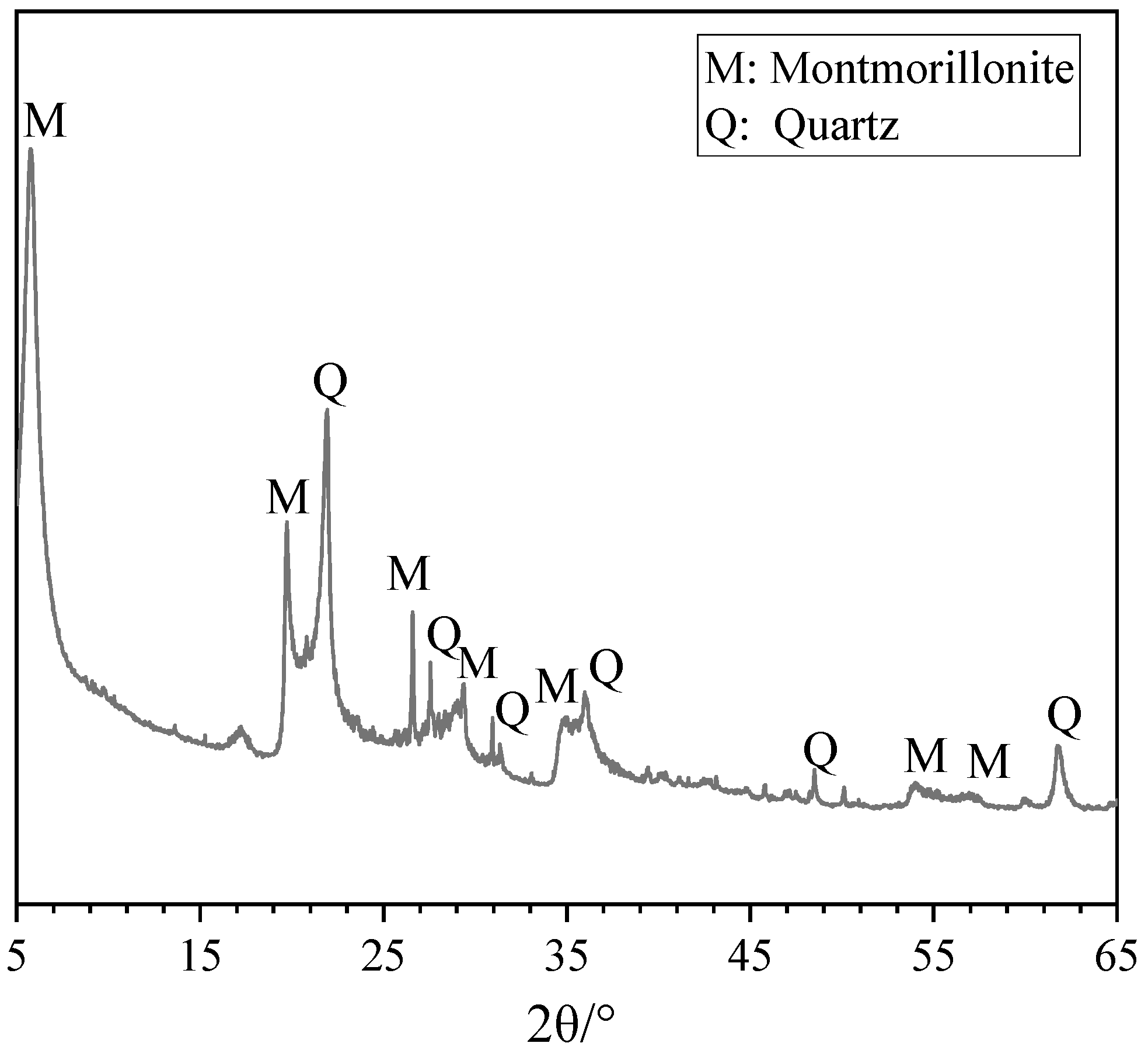 A sodium bentonite sourced from Gaomiaozi, Inner Mongolia, with a particle size of 300 mesh, was used in this study. The mineralogical composition of the raw bentonite was first characterized using XRD. As shown in Figure 1, the bentonite primarily consists of quartz (PDF#96-901-2601) and montmorillonite (PDF#96-900-2780). It is noted that all PDF cards used in this study were obtained from the Crystallography Open Database (COD).