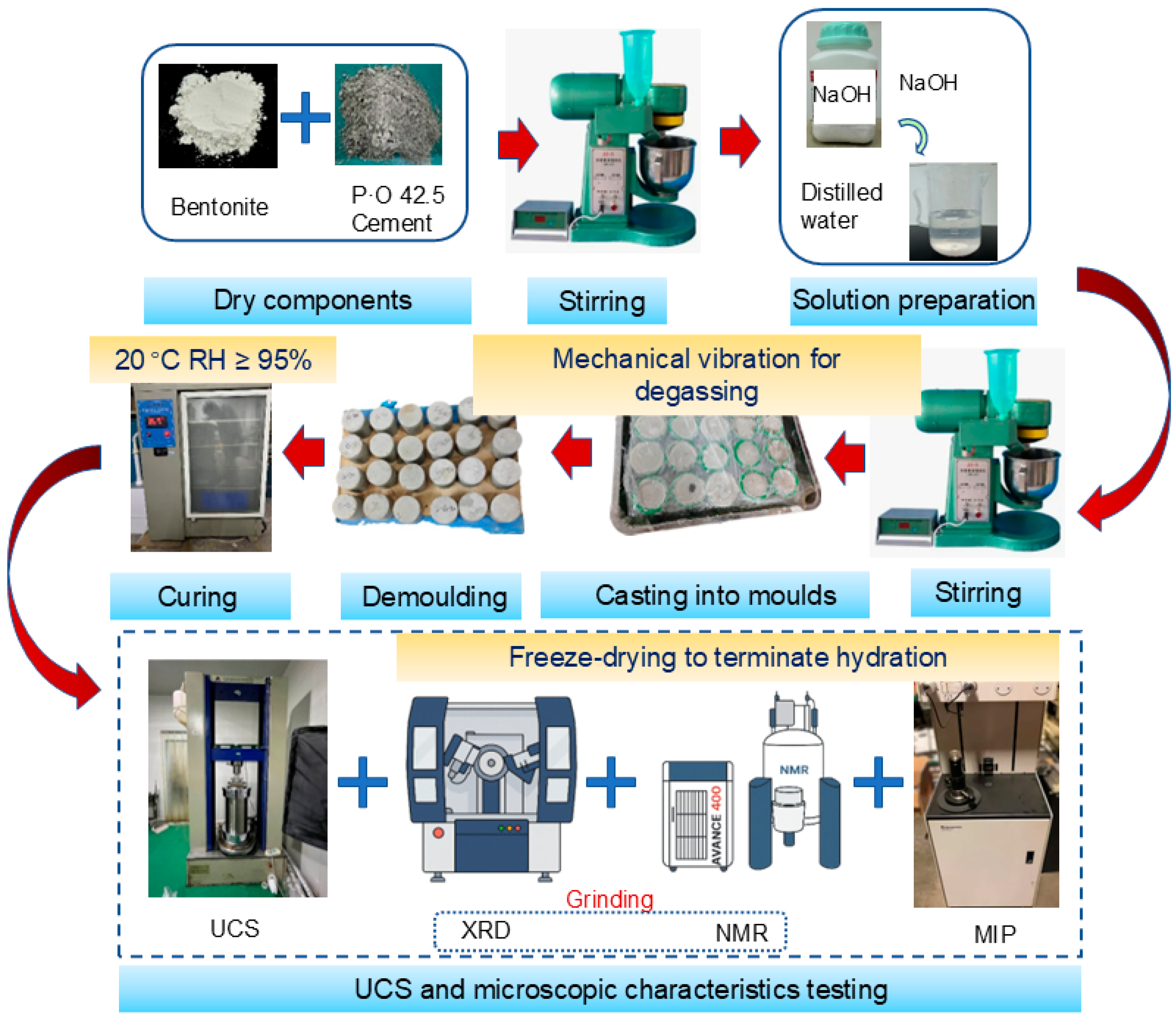 With the cement content fixed at 25%, different alkaline environments were established by varying the NaOH concentration in the mixing water (1, 3, 5, and 8 mol/L) to systematically investigate the effects of alkalinity on the mechanical properties and structural evolution of cement-stabilized bentonite. Specimens were designated using the format “soil type–cement content–NaOH concentration”; for example, a specimen with a cement content of 25% and a NaOH concentration of 1 mol/L was denoted as Bent25-1. The preparation of specimens and the corresponding experimental procedures, including mixing, casting, curing, and subsequent mechanical and microstructural tests, are schematically illustrated in Figure 3.