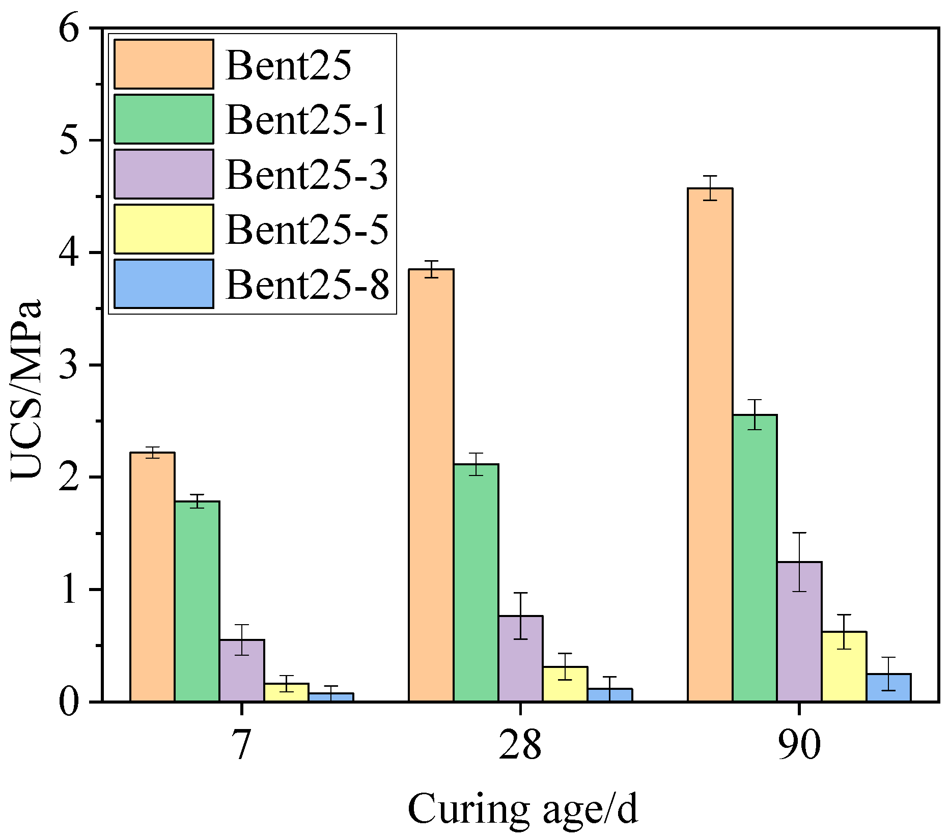 Figure 4 illustrates the evolution of UCS for cement-stabilized bentonite specimens prepared with different NaOH concentrations (0, 1, 3, 5, and 8 mol/L) at curing ages of 7, 28, and 90 d. For each mix group, three parallel specimens were tested; if the strength of any specimen deviated from the average by more than 10%, that specimen was discarded, and the mean of at least two valid results was taken as the UCS for the corresponding group, with the error bars in Figure 4 representing the standard deviation (SD) of the valid results. Overall, the UCS of all specimens increases significantly with curing time, indicating the continuous progression of cement hydration and the gradual densification of the stabilized matrix.