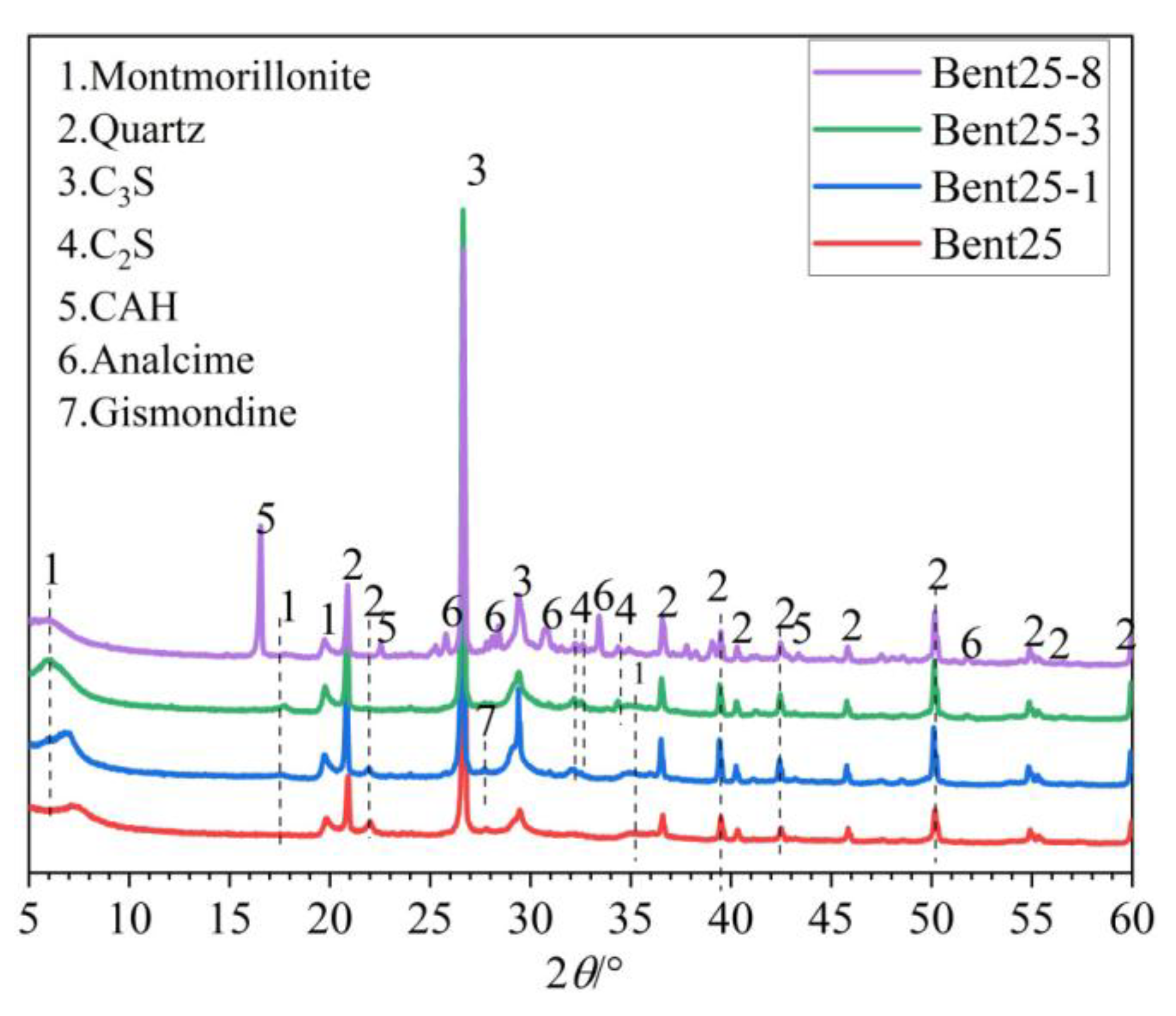 To examine the phase evolution of cement-stabilized bentonite under different alkali concentrations and to relate these changes to the strength development, representative mixtures (Bent25, Bent25-1, Bent25-3, and Bent25-8) were subjected to XRD analysis (Figure 5).