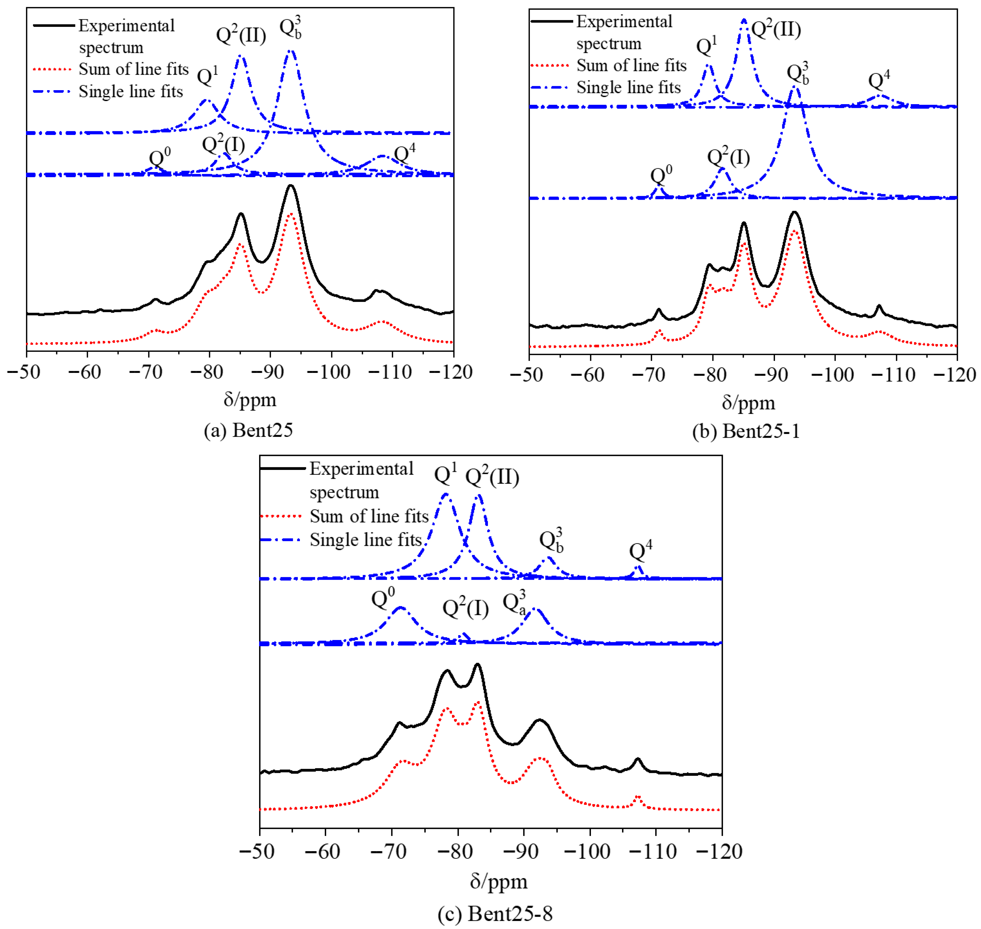 To further elucidate the effect of alkali dosage on the evolution of the silicate framework and its relationship to strength development, representative samples (Bent25, Bent25-1, and Bent25-8) were analyzed using 29Si NMR. The deconvoluted spectra are presented in Figure 6, and the relative proportions of Qn species together with the mean chain length (MCL) are summarized in Table 3.