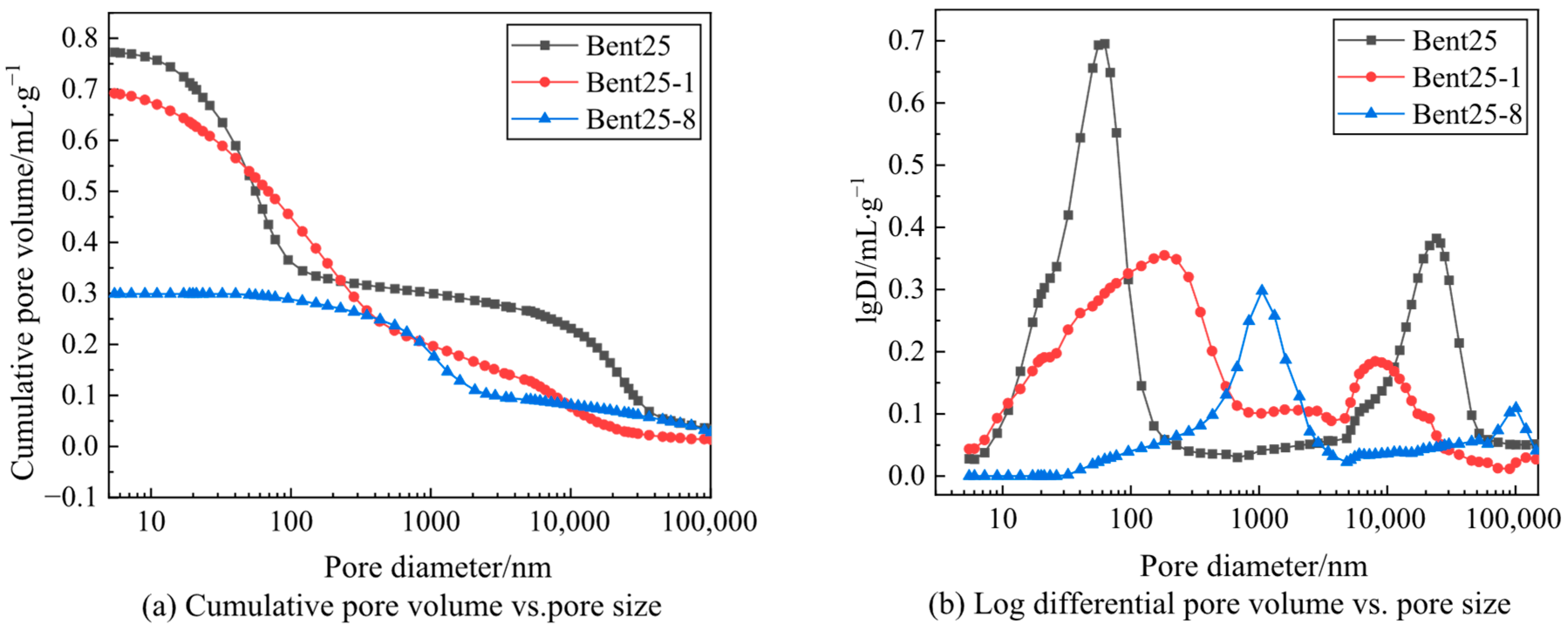 To examine the influence of alkali dosage on the pore characteristics and structural compactness of cement-stabilized bentonite, representative samples (Bent25, Bent25-1, and Bent25-8) were subjected to MIP testing. The cumulative intrusion curves and differential pore-size distributions are shown in Figure 7a and Figure 7b, respectively.