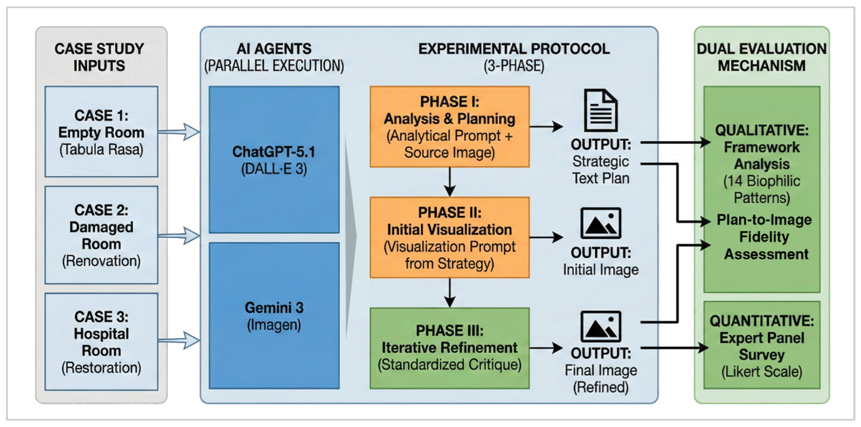 Figure 1, the experiment used three interior case inputs (tabula rasa, contextual renovation, and strategic restoration) processed in parallel through a standardised three-phase protocol: (Phase I) analysis and planning from the source image and analytical prompt to generate a strategic text plan; (Phase II) initial visualisation to generate a first photorealistic image from the strategy; and (Phase III) iterative refinement using a standardised critique structure to produce a refined final image selected for analysis. Data collection and evaluation followed a dual mechanism combining (1) qualitative framework-based coding of the textual plans (14 Patterns of Biophilic Design) together with plan-to-image fidelity assessment, and (2) quantitative ratings of the final images via an independent expert-panel Likert-scale survey. This mixed-methods structure grounds interpretation in both theory-informed qualitative analysis and systematically collected expert judgements, while acknowledging that differences in renderings may partly reflect the characteristics of the image-generation models (DALL·E 3 vs. Imagen) in addition to the preceding textual plans.