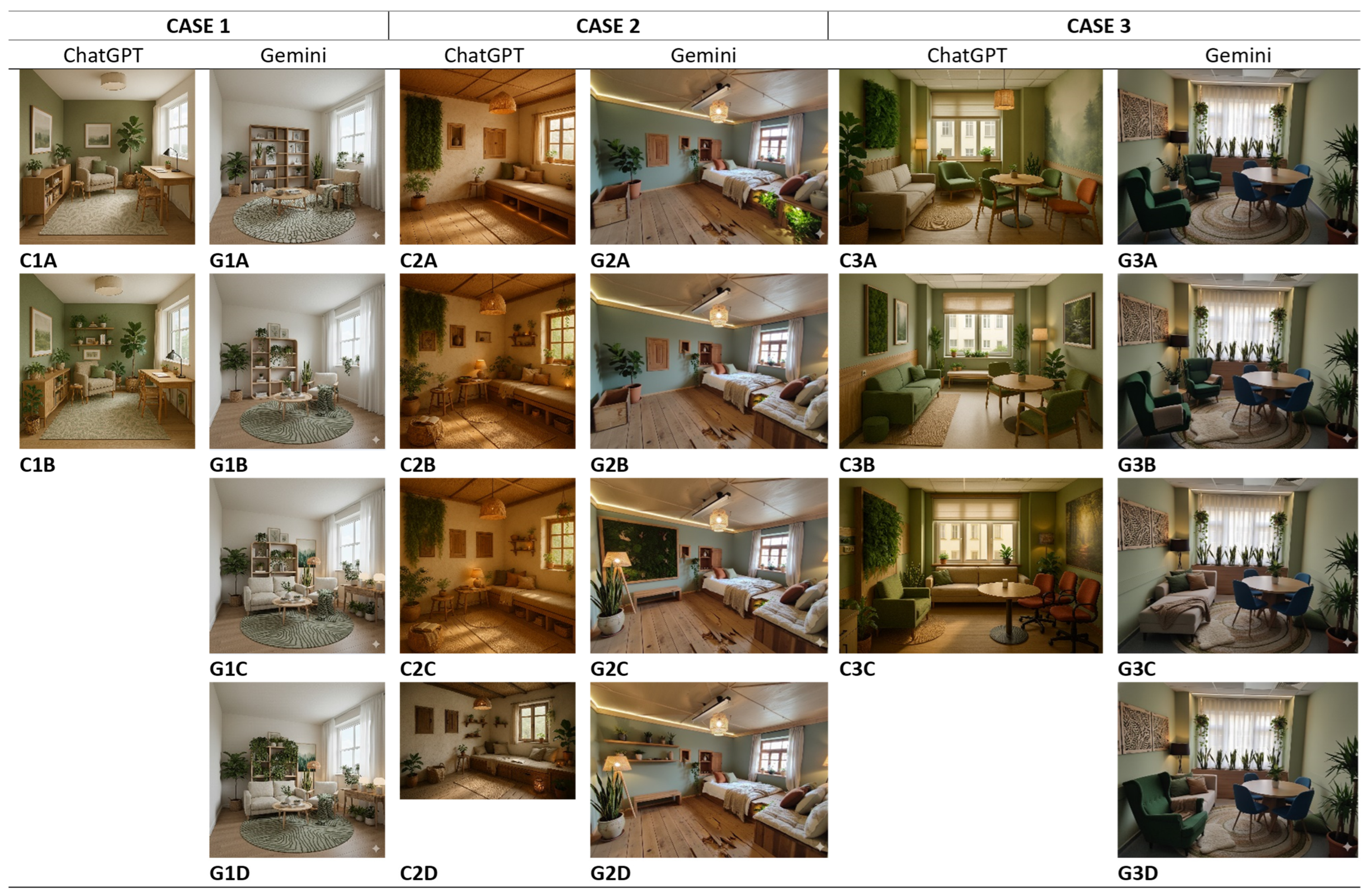 In sum, across the three cases, ChatGPT and Gemini demonstrate that generative AI can already play a supportive but limited role in biophilic design. They are capable of generating structured, sometimes sophisticated biophilic narratives and visually plausible scenes, yet they fall short in reliably translating full biophilic intent, especially non-visual and performative dimensions, into images that experts would consider truly restorative or buildable.