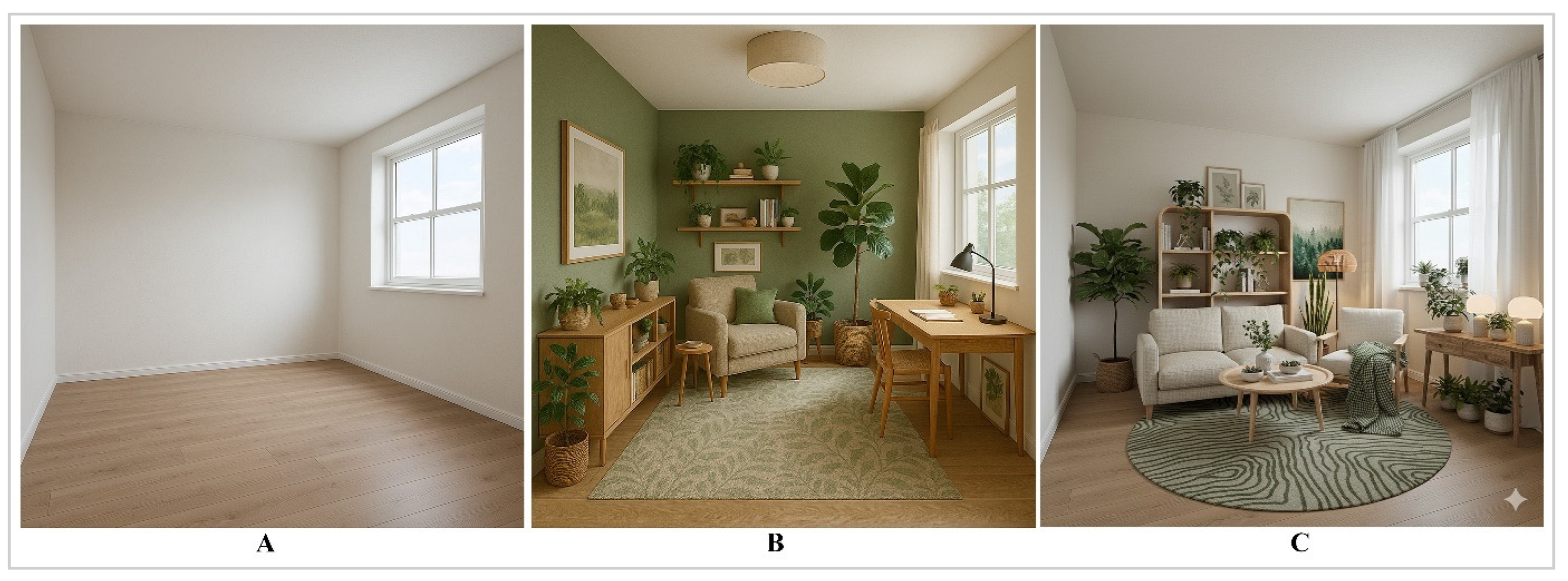 In this paper, “plan” refers to the AI-generated textual spatial strategy (implied layout logic, activity placement, and circulation intent) derived from single-view interior images, rather than a measured architectural floor plan. Likewise, “zones” are used to describe implied functional groupings (e.g., work vs. refuge/relaxation areas) inferred from the proposed layout logic and the visible room affordances. Because the case inputs are photographic interior perspectives without verified dimensions, the analysis does not treat room scale metrically; therefore, references to “human-scaled complexity” are interpreted as perceptual qualities (as operationalised through pattern-based coding and expert judgement) rather than dimensioned, construction-ready claims.
