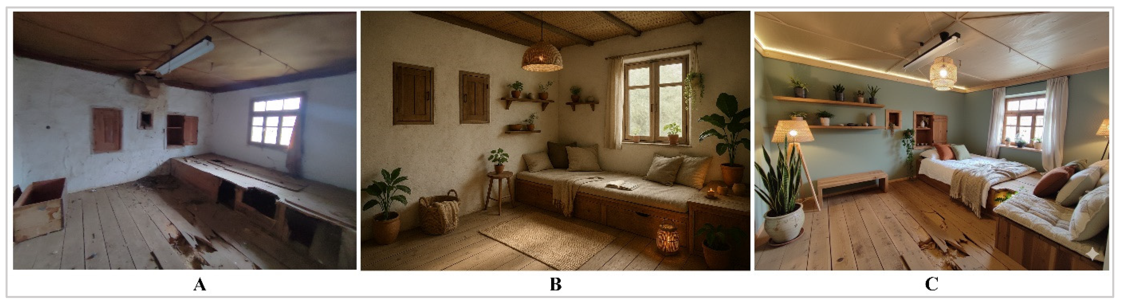 Case 2—“Contextual Renovation” (Problem-Solving and Contextual Awareness Test): This case presented a rustic and visibly damaged room that included a distinctive built-in wooden platform. The aim was to assess the models’ analytical and problem-solving abilities, including their capacity to identify and address observable damage and to recognise, preserve, and meaningfully incorporate unique architectural features within a biophilic design proposal (