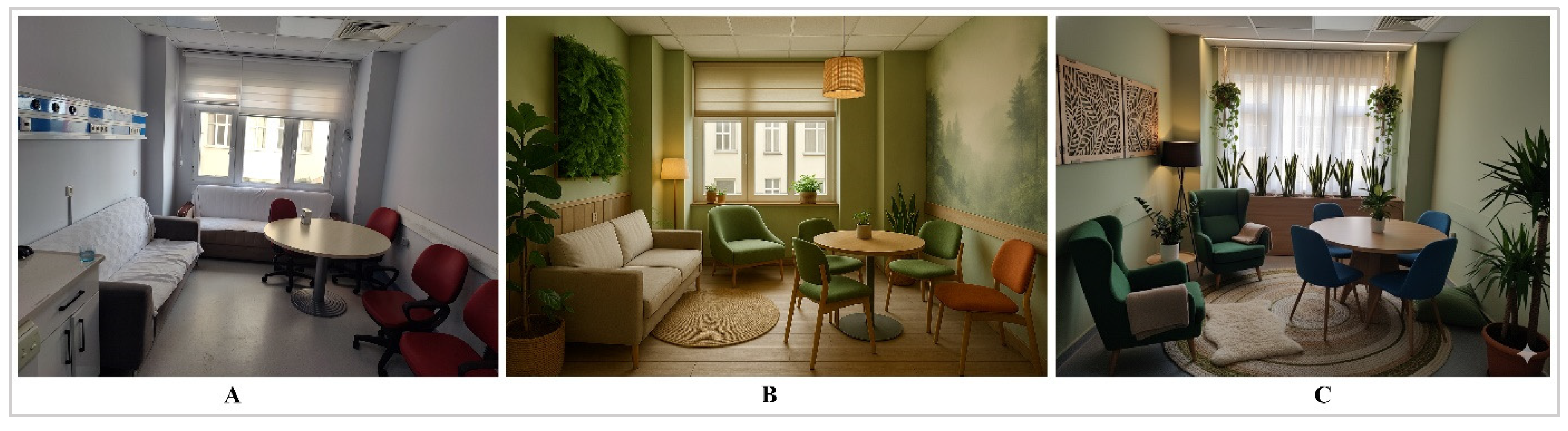 Case 3—“Strategic Restoration” (Psychological Objective Test): The third case involved a sterile hospital staff break room. This scenario examined the models’ strategic competence in applying biophilic design principles to achieve a defined psychological outcome. The design brief instructed the AI tools to transform the space into a “cognitive restoration sanctuary” for high-stress healthcare staff. This required the models to consider stress reduction and mental recovery as explicit design goals, while also navigating fixed constraints, such as a wall-mounted medical panel, and utilising available assets, including a large exterior window (
