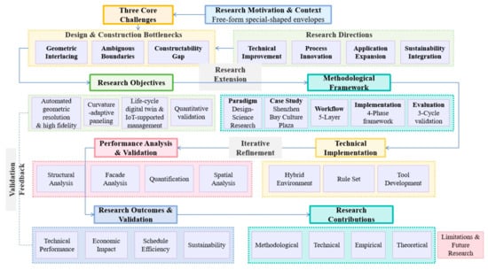 Building upon this theoretical foundation, this study adopts a Design Science Research (DSR) methodology to develop, implement, and evaluate a novel rule-based digital twin artifact for the life-cycle delivery of free-form architecture [30,31]. The DSR paradigm is appropriate as it focuses on creating and assessing innovative artifacts designed to solve identified organizational problems—in this case, the three persistent bottlenecks in delivering complex, free-form, special-shaped envelopes. The research progresses through iterative cycles of artifact building, demonstration, and evaluation within the real-world context of the Shenzhen Bay Culture Plaza project (Figure 1).