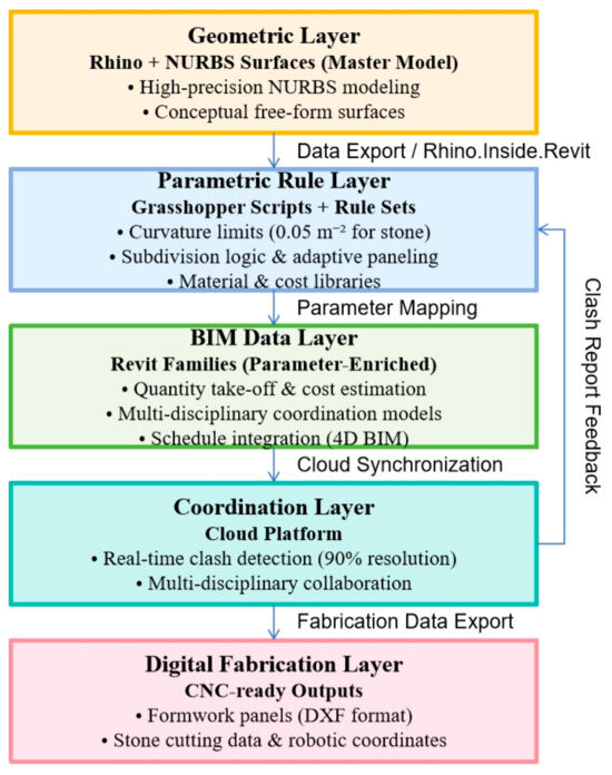 The workflow operates through five synchronized layers that function as an integrated system. The Geometric Layer involves Rhino hosting the master NURBS model, with Grasshopper scripts generating all derived geometry. The Parametric Rule Layer encodes design constraints, optimization objectives, and fabrication logic. The BIM Data Layer consists of Revit models enriched with parameters for quantity, cost, schedule, and performance. The Coordination Layer provides a cloud platform enabling real-time multi-disciplinary collaboration. Finally, the Digital Fabrication Layer produces CNC-ready outputs for formwork, rebar, and stone panels (Figure 5).