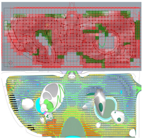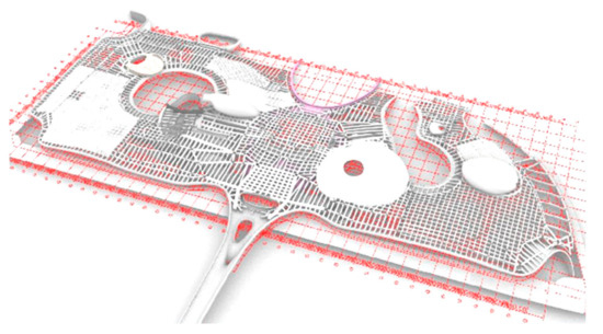 The parametric model enabled real-time grid adjustment, where structural column positions automatically adjusted to follow roof undulations. Load path optimization was achieved by parametrically mapping dead loads from soil cover of variable thickness (0–3 m) and live loads from public activity to structural elements. Clear-height verification was automated, checking minimum clear heights of 4.5 m for public zones and 3.5 m for service areas.