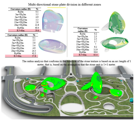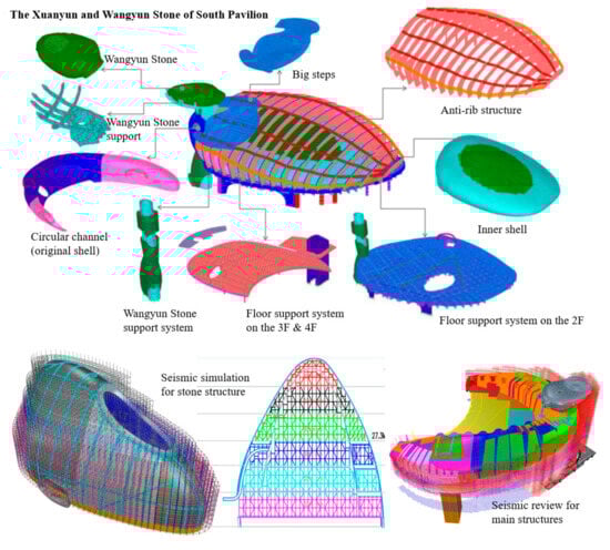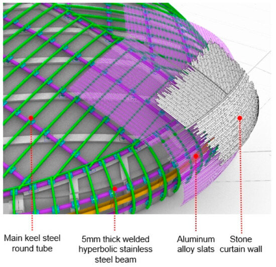 Type 2 encompasses the irregular stone clusters, both internal and external, characterized by an exterior stone curtain wall assembled from tightly jointed natural stone panels and an interior exhibition hall executed in cast-in-place fair-faced concrete. The outer curtain wall surface comprises stone strips with visible joints, introducing critical design issues including subdivision of unit panels for heavy curtain walls, which total 440,000 panels (Table 3). The zig-zag jointing patterns between panels require curvature-adaptive detailing [19,20], while installation logistics for lifting and placing heavy stone panels on irregular surfaces present significant challenges. Waterproofing of irregular curtain wall geometries without compromising visual appearance must be addressed, along with structural safety assessment against stone panel detachment under wind and seismic loads. The Mayan-irregular nature of these surfaces means that no two panels are identical, necessitating mass customization approaches.