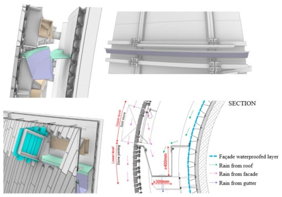 The analysis involved elevation contour mapping, where raindrop simulations were overlaid upon elevation contour lines to trace water flow. Innovative drainage geometry introduced a “direction line” concept that replaced conventional drainage gutters, using stepped interception gutter geometry. Efficiency validation achieved 98% water-collection efficiency during a 100-year storm event. Visual–functional unification was maintained, as the solution preserved the crisp joint appearance while ensuring functional drainage.