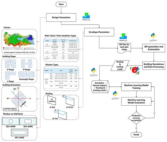 Accordingly, this study aims to develop a machine learning-based early-stage energy prediction framework to estimate annual heating and cooling energy demand of school buildings across Türkiye’s six climatic regions defined by TS 825, the “TS 825 Thermal Insulation Requirements for Buildings” standard, which serves as Türkiye’s principal regulation for thermal insulation and building envelope performance (TS 825:2024) [24,25]. The framework is based on a simulation-generated dataset obtained by systematically varying key architectural and envelope-related design parameters, enabling rapid energy performance prediction without reliance on time-intensive simulations. In addition, the proposed approach supports identification of influential design parameters to inform climate-responsive early-stage design decisions for educational buildings. The specific objectives of the study are to: