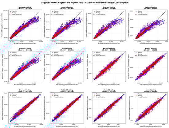 Surrogate models have also been integrated into optimization frameworks to further improve computational efficiency [38]. For instance, an SVR-based surrogate trained on EnergyPlus simulation data was embedded within a Bayesian optimization workflow to identify energy-optimal envelope design parameters for an office building, achieving substantial reductions in computational effort while maintaining predictive accuracy [39]. Similar surrogate-assisted optimization approaches have been applied in the Turkish context to support envelope design under national regulatory constraints, demonstrating the feasibility of combining simulation-driven machine learning with regulation-informed design variables [40].