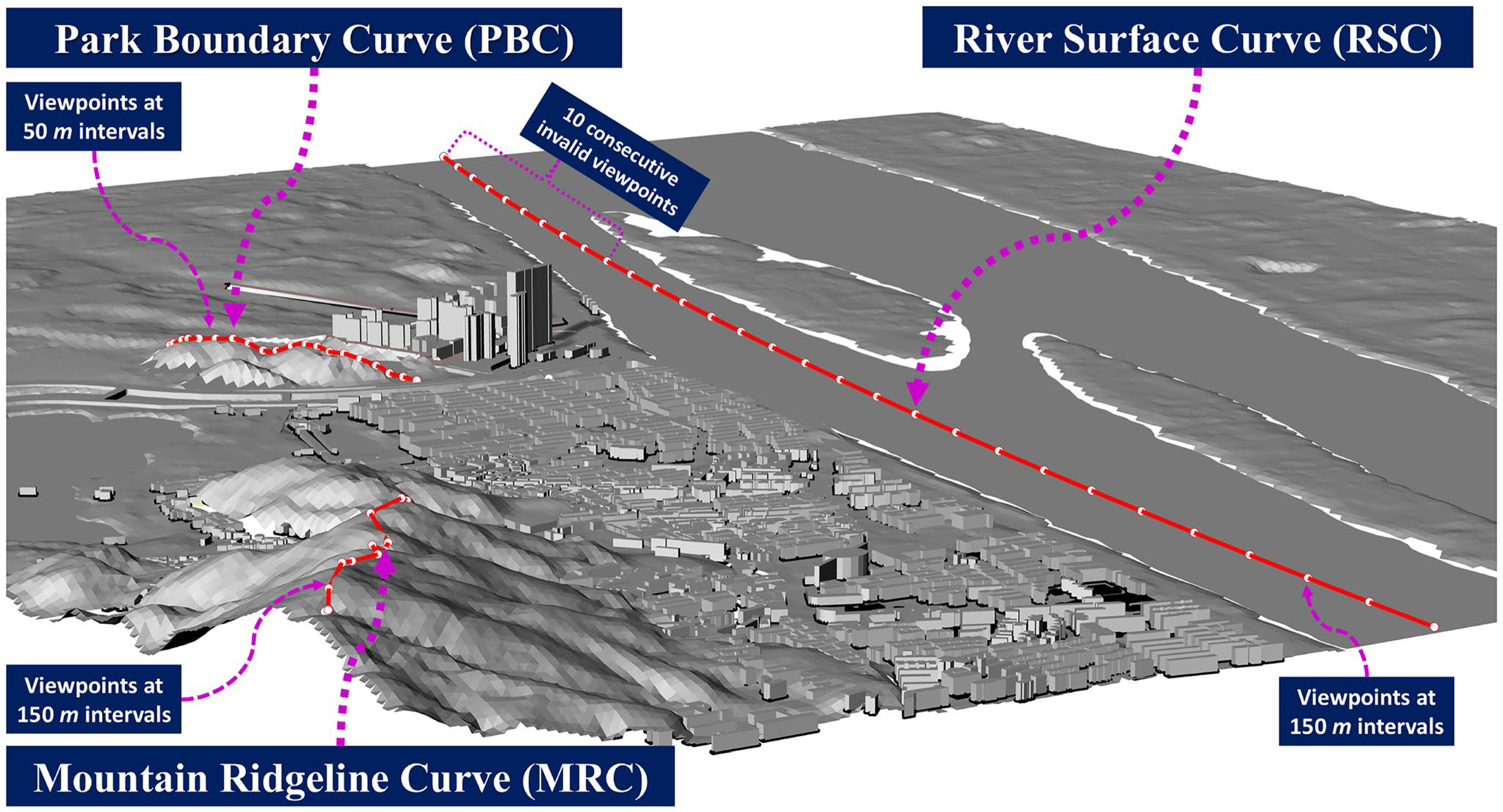 - Distance-based Spacing: For proximal landscape resources (Park), equidistant viewpoints were set at intervals of less than 50 m. For distant resources (River and Mountain), the interval was set within 150 m.