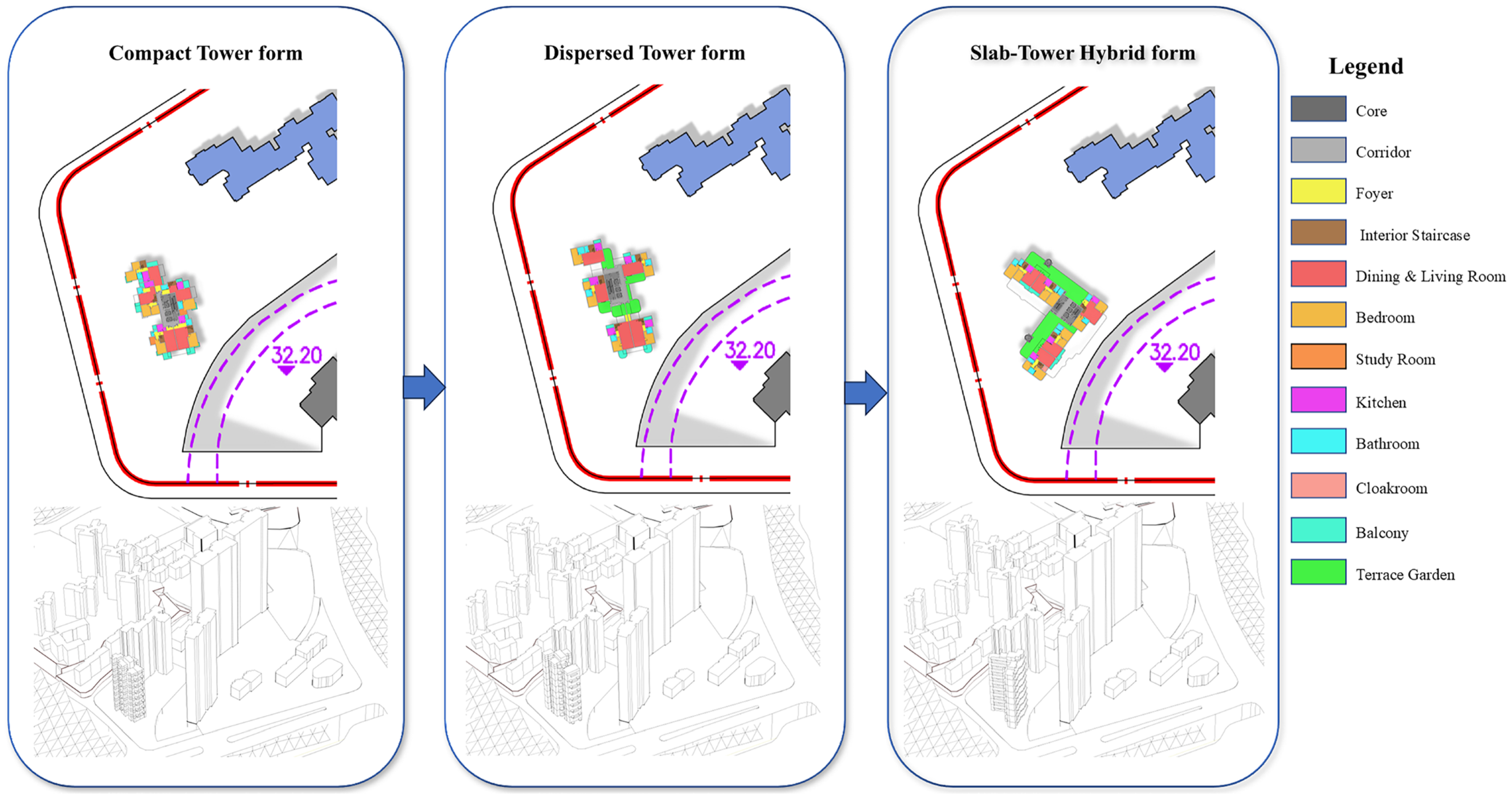 | Compact Tower Residence | Dispersed Tower Residence | Slab–Tower Hybrid Residence | |||||||