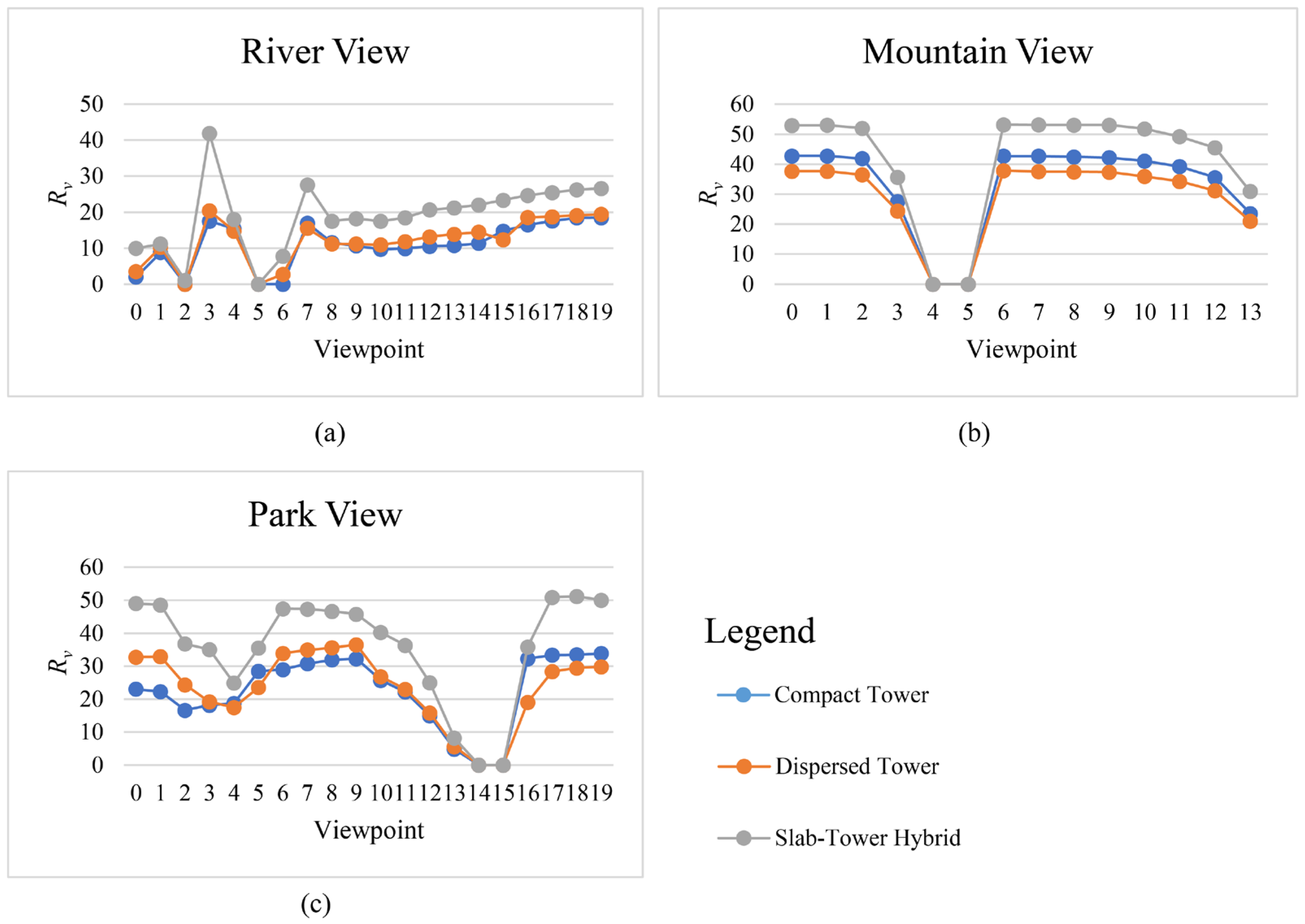 - River View (Figure 10a): The Slab-Tower Hybrid (Gray line) shows a distinct advantage. Notably, at Viewpoint 3, the Hybrid achieves a visibility rate exceeding 40%, whereas the other prototypes remain below 20%. It maintains a consistent lead from Viewpoint 7 to 19.