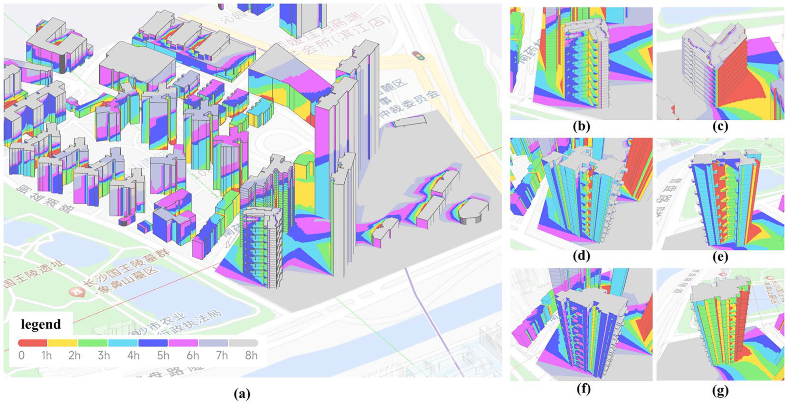 - Sunlight Analysis: Simulations were calibrated to the “Great Cold Day” (January 20), compliant with the Chinese National Standard. The simulation covered the effective time window from 8:00 to 16:00, utilizing a temporal sampling step of 5 min. The calculation plane was set at 0.9 m above the floor level, with a rigorous mesh size of 1.0 × 1.0 m.