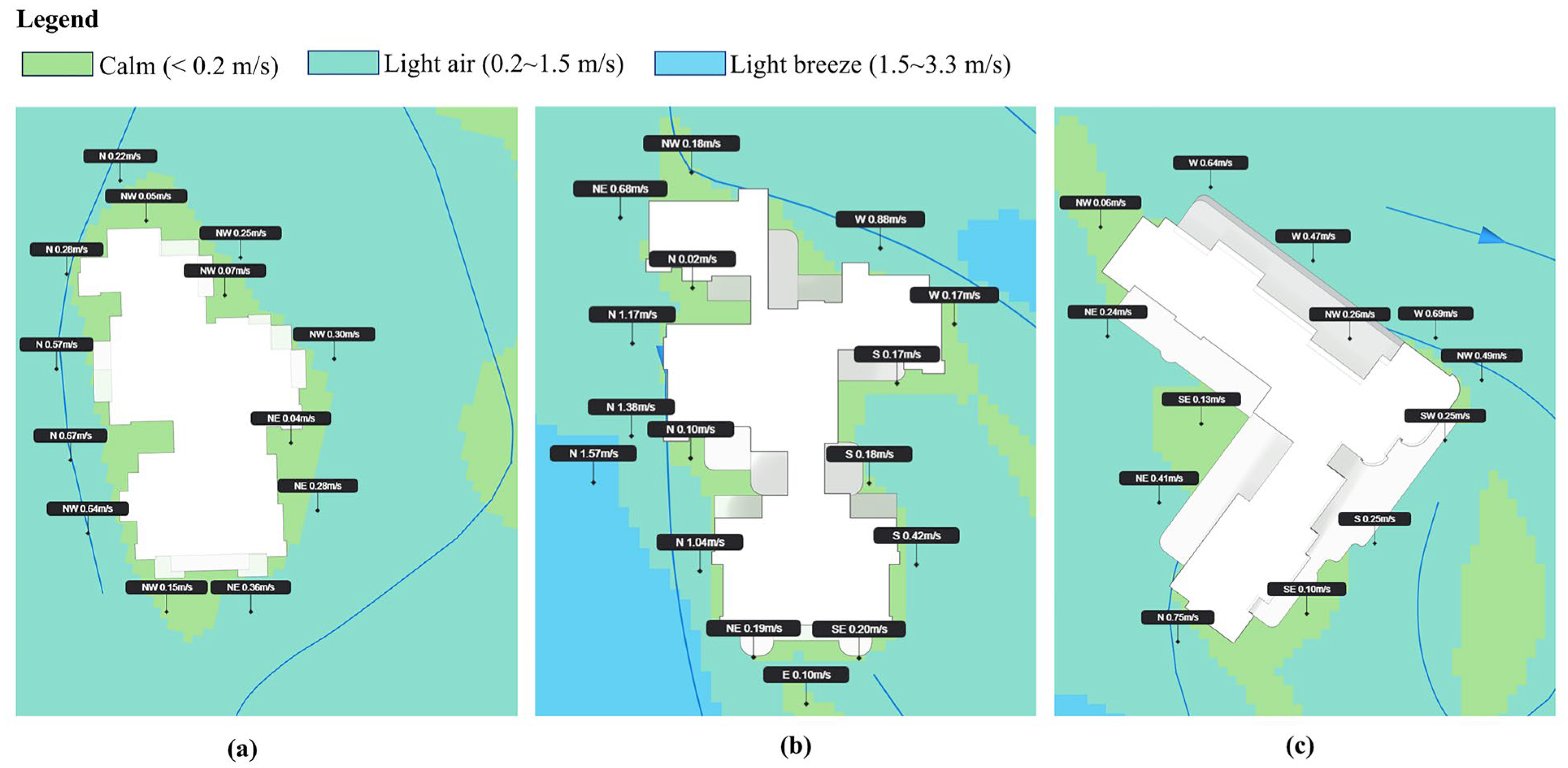 - Slab-Tower Hybrid: The hybrid form demonstrates optimal ventilation performance. Its articulated linear geometry effectively acts as a wind guide, channeling the prevailing winds to maintain a consistent speed range of 0.4–0.7 m/s (Soft Breeze) across most facades. This stable wind pressure distribution is crucial for facilitating effective cross-ventilation for the majority of residential units.