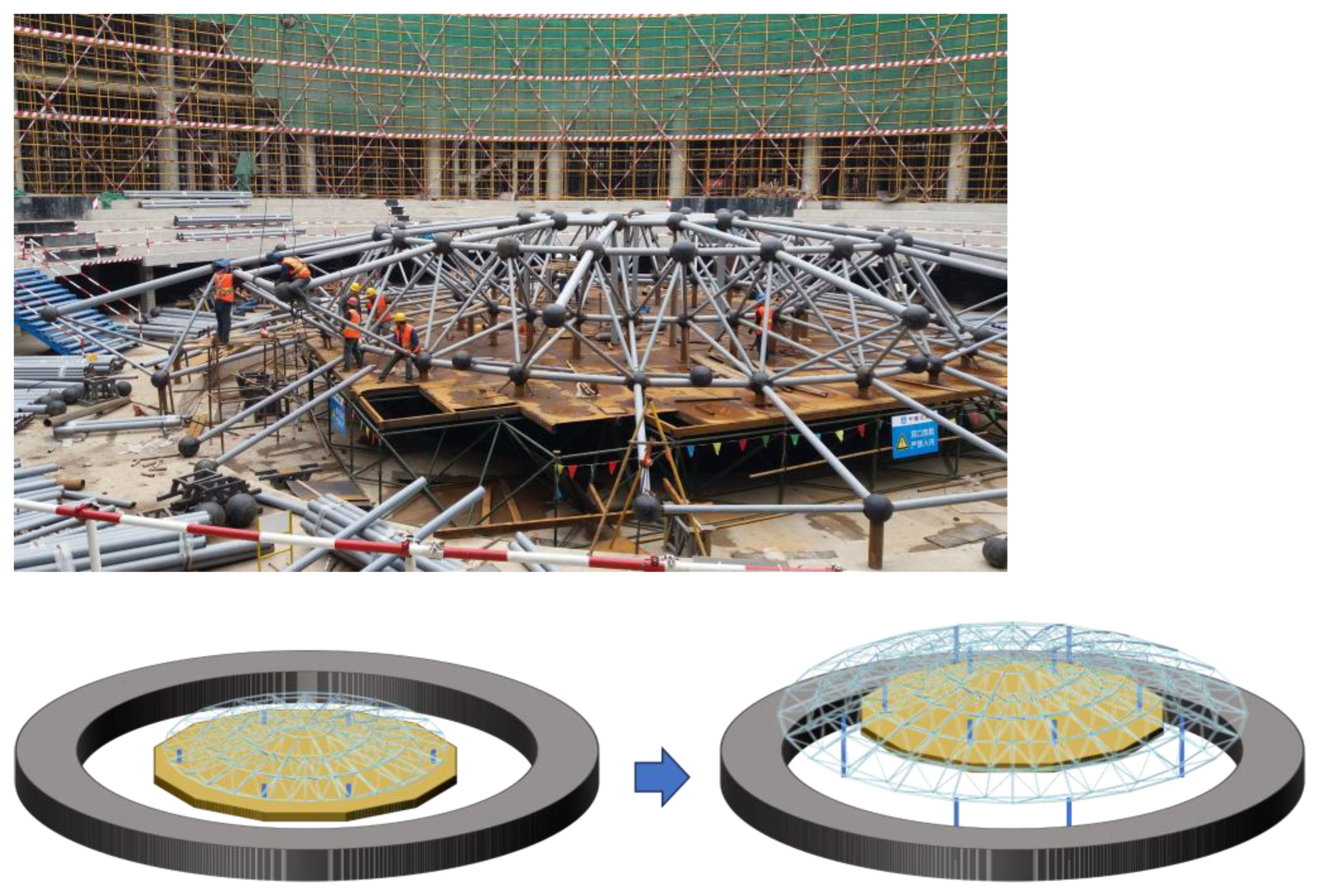 - Wang, Q.L.; Zhou, L.Y.; Shi, J.Z.; Xu, B.L.; Bu, Z.M.; Wang, B. Research on rapid integral lifting method and progressive collapse prevention analysis of long-span steel latticed shells. J. Cent. South Univ. (Sci. Technol.) 2024, 55, 538–549. (In Chinese) [Google Scholar]