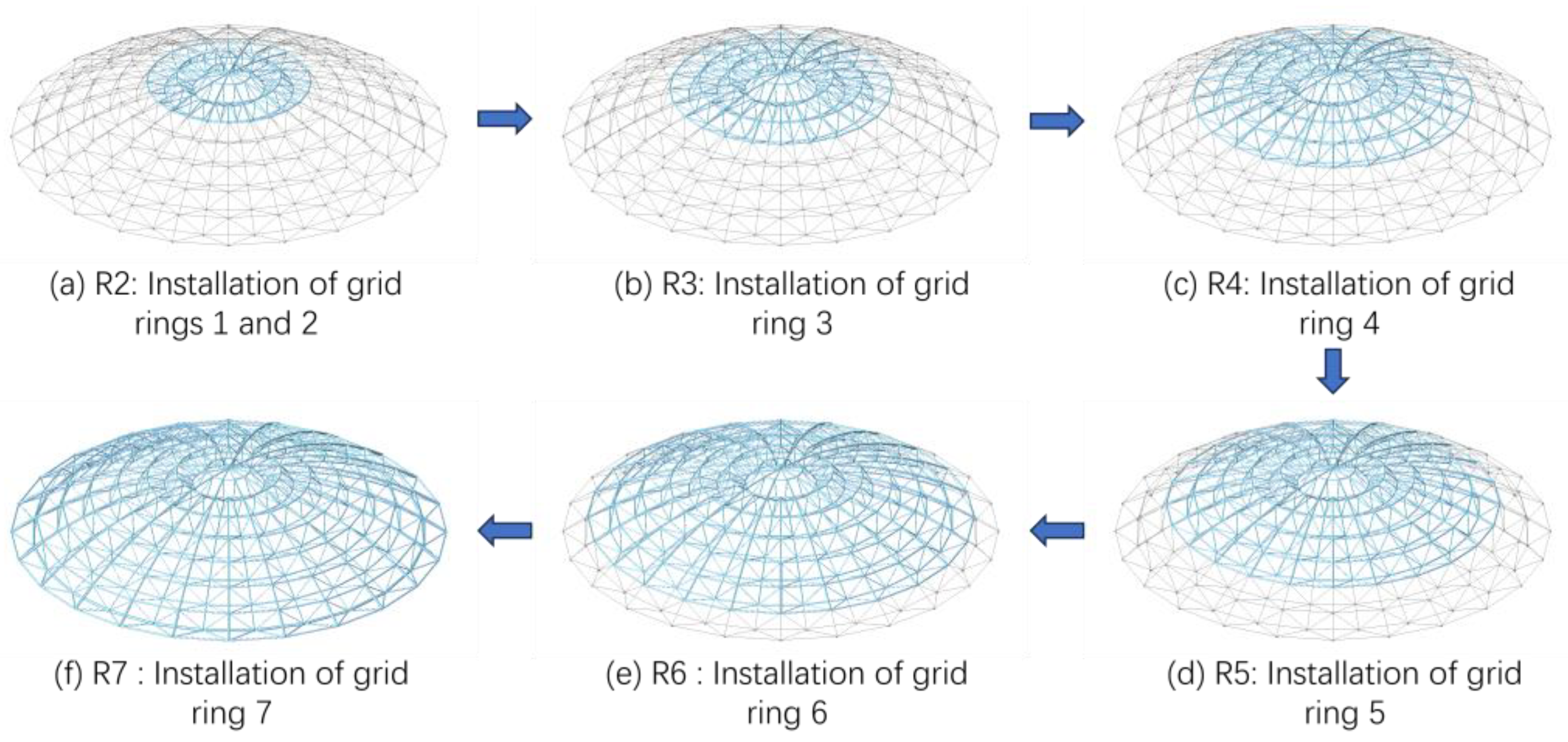 - Guo, X.; Sui, Z.; Li, Z.; Zhang, J.; Zhang, Y.; Zong, S. Efficient analysis and evaluation method for overall lifting of large-span spatial grid structures. J. Build. Eng. 2024, 96, 110657. [Google Scholar] [CrossRef]