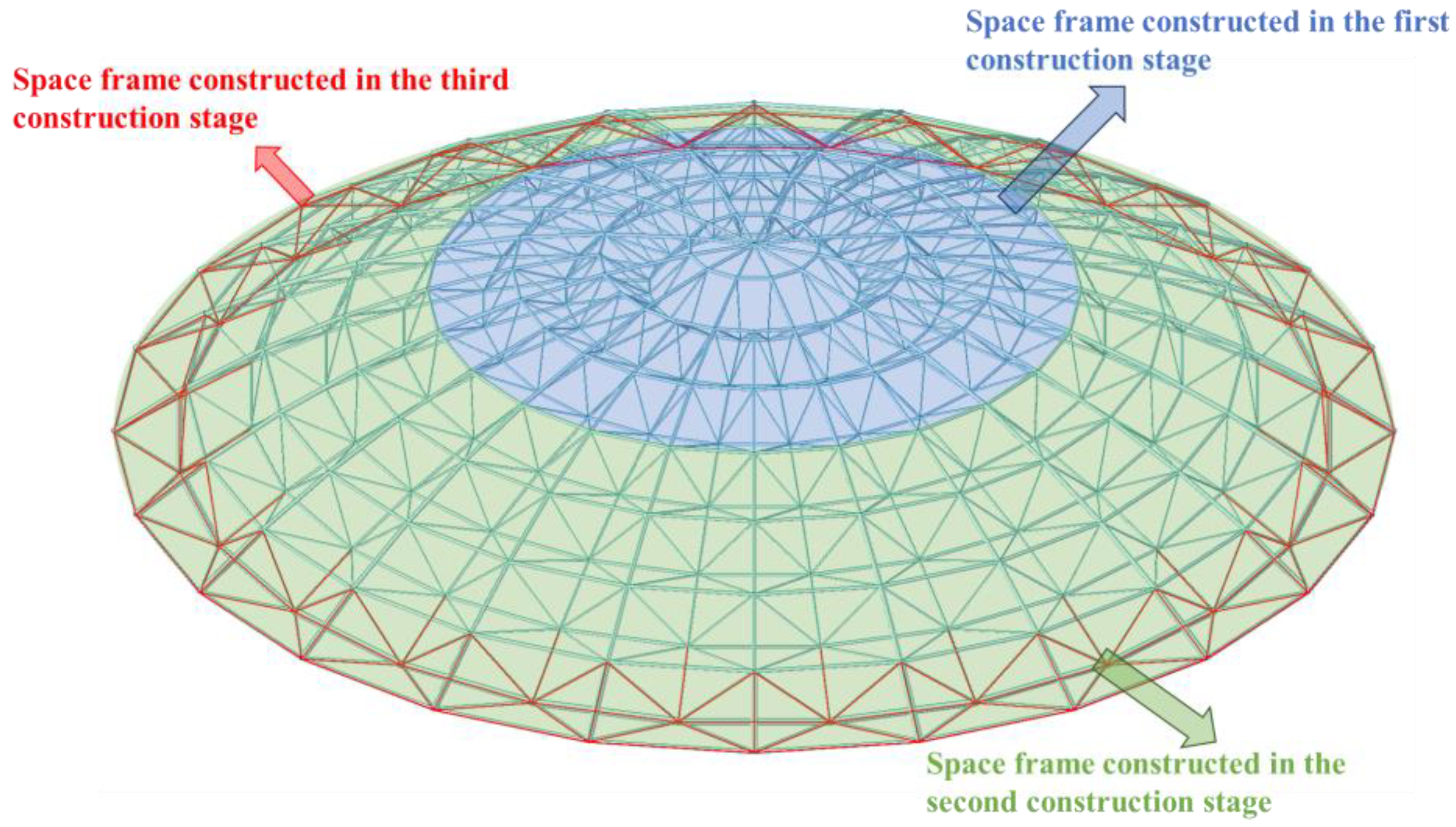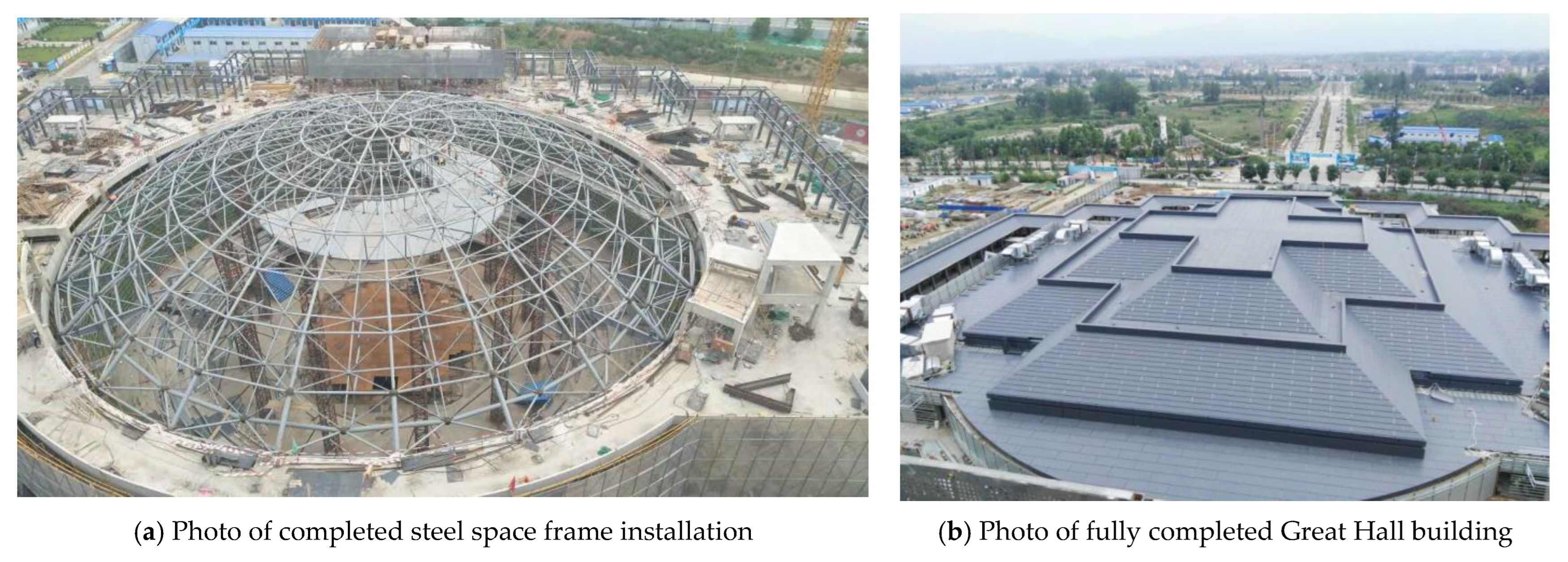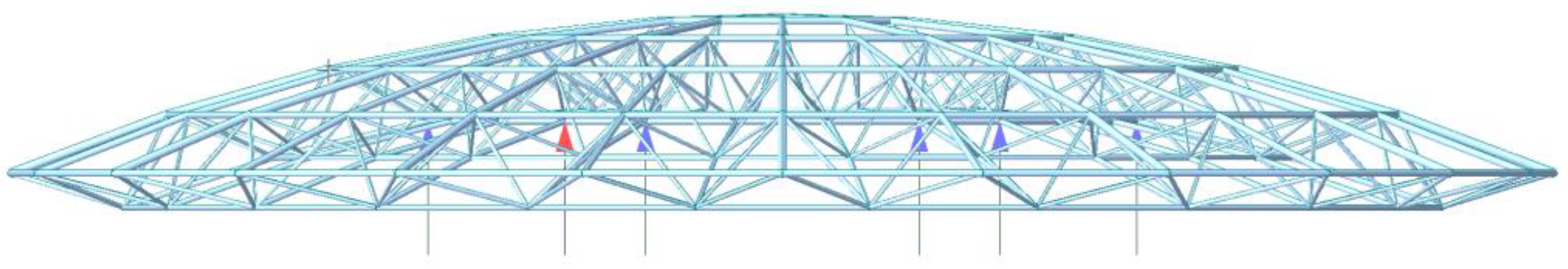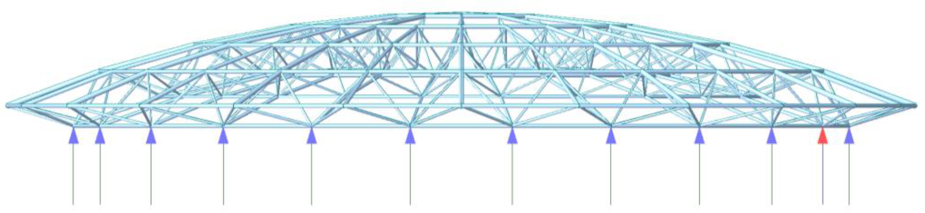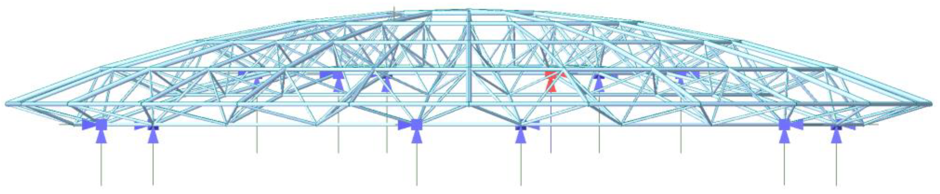 - Du, W.F.; Zhu, Z.H.; Zhu, L.M. Comparison of four structural schemes for the roof design of Qinyang Stadium. In Proceedings of the 2nd International Conference on Civil Engineering and Building Materials (ICCEBM 2013), Chengdu, China, 17–18 May 2013. [Google Scholar]