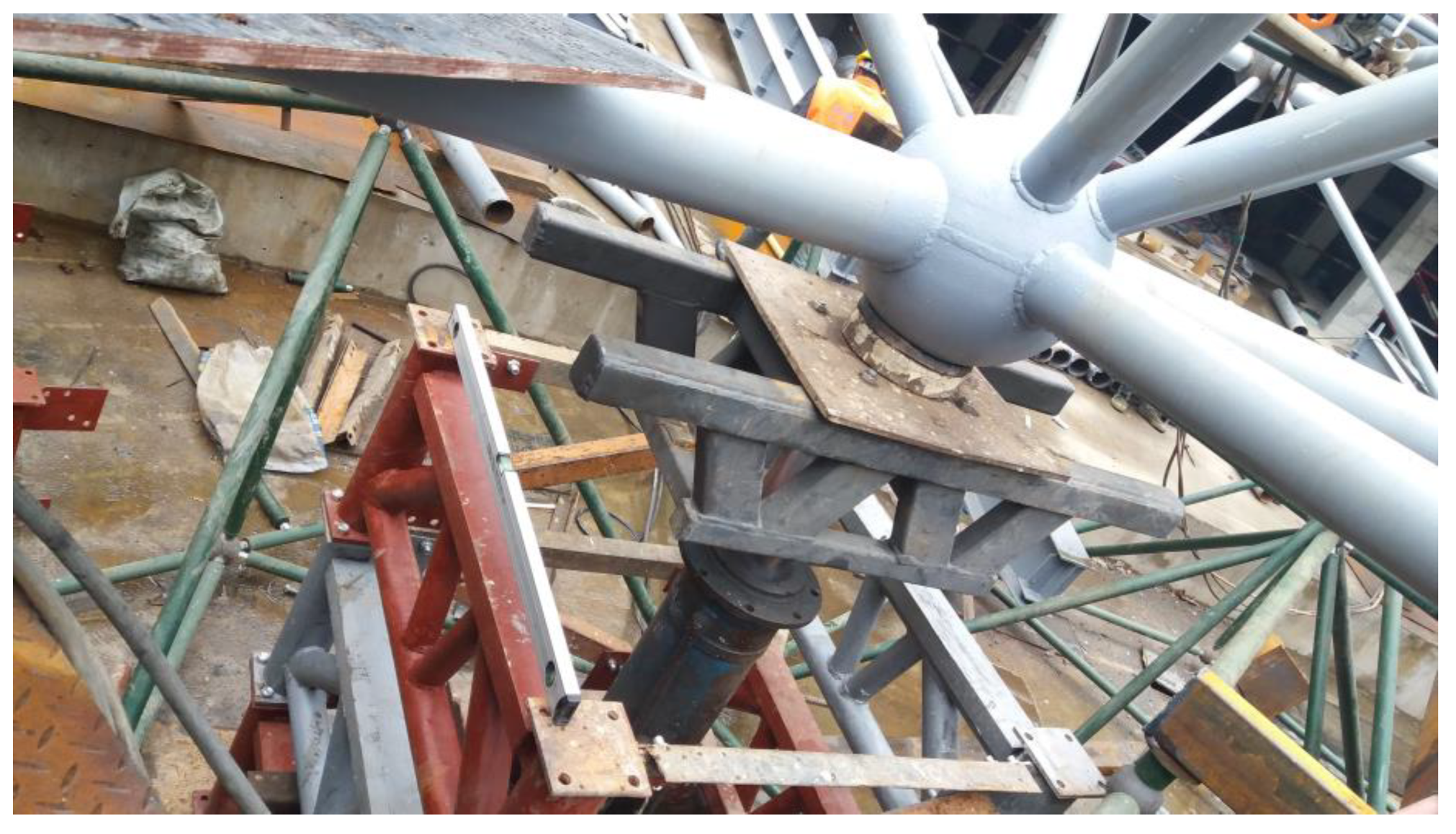 - Liu, Z.; Jin, C.; Zhang, Q. Intelligent safety control modeling and construction process control of steel mesh frame structures. Structures 2025, 78, 109158. [Google Scholar] [CrossRef]