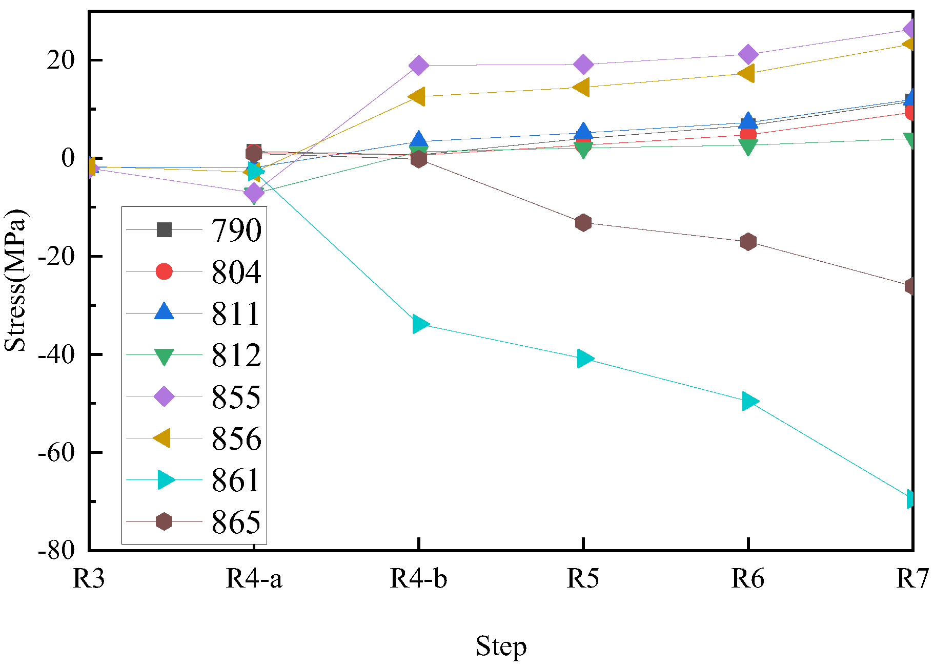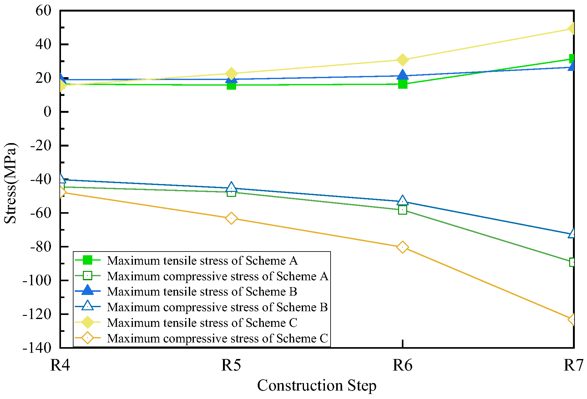 4.3. Stress Evolution of Critical Members Throughout the Entire Process