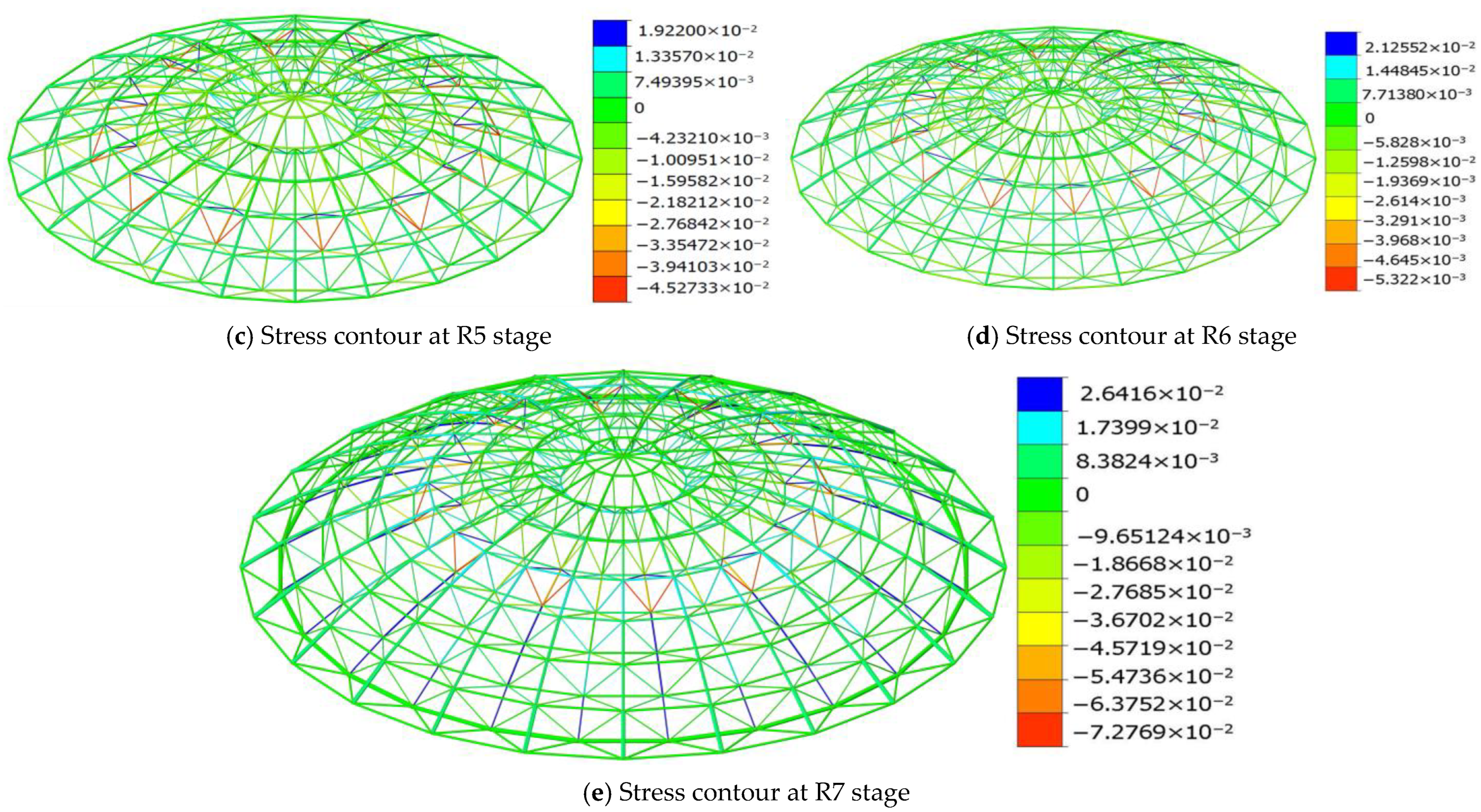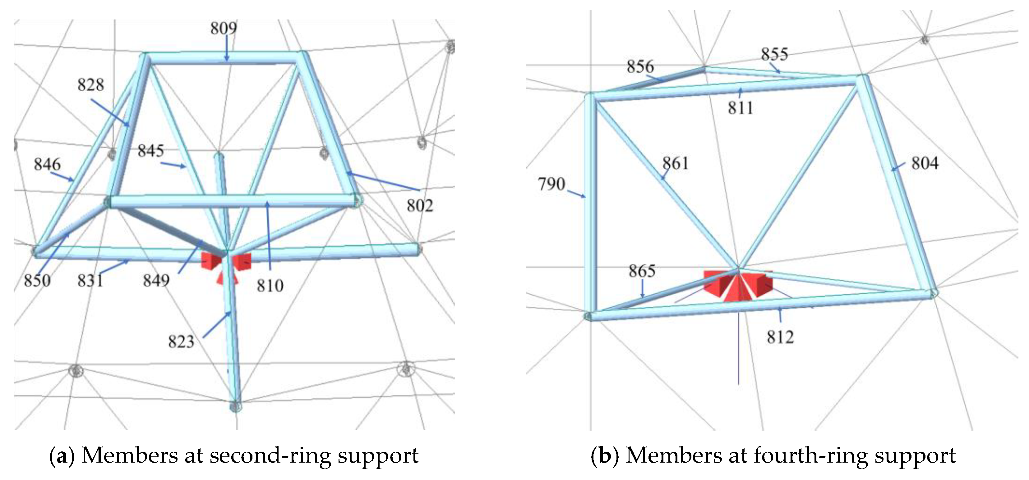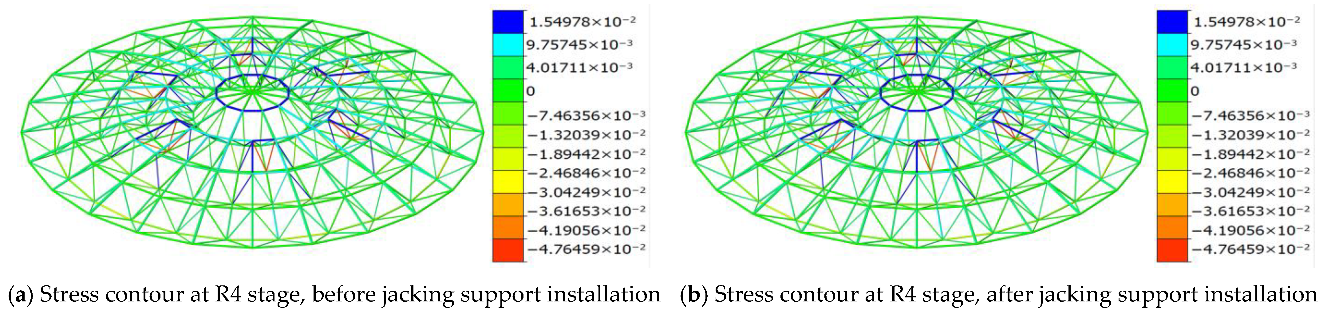 - During construction, the region of stress concentration in the structure gradually shifts from the supports of the sixth ring to those of the fourth ring. In the course of the system transformation, the stresses in some members (such as web members No. 845 and No. 849) exhibit abrupt changes from compression to tension, which is a typical manifestation of load path reconstruction. Field measurements indicate that this process is globally controllable and does not trigger any structural instability.