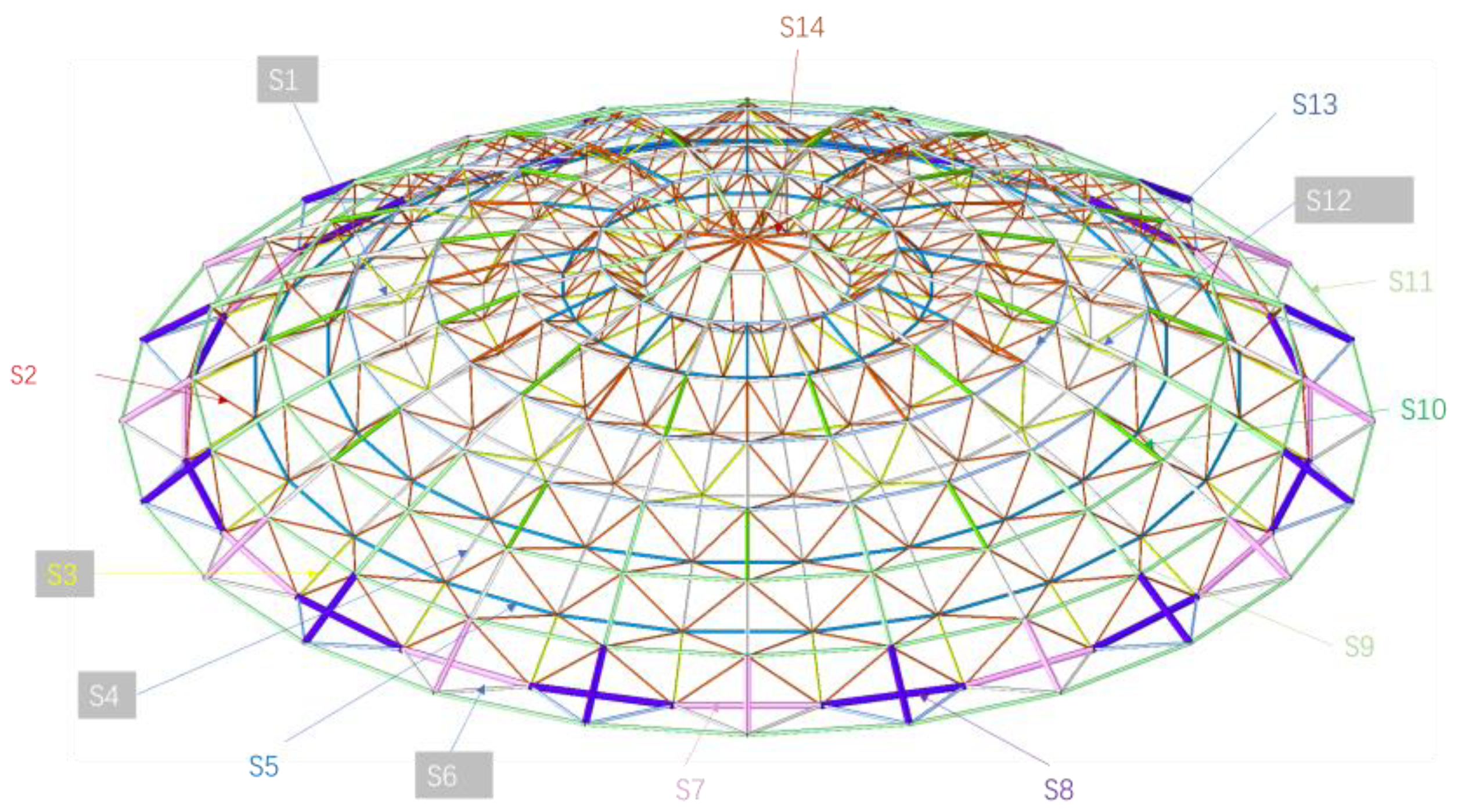 - Liu, Y.; Dong, Y.; Li, Q.; Pan, P.; Ding, Y. Static behavior of a novel steel grid concrete composite shell: Analytical and numerical study on the ideal dome. Thin-Walled Struct. 2025, 207, 113880. [Google Scholar] [CrossRef]