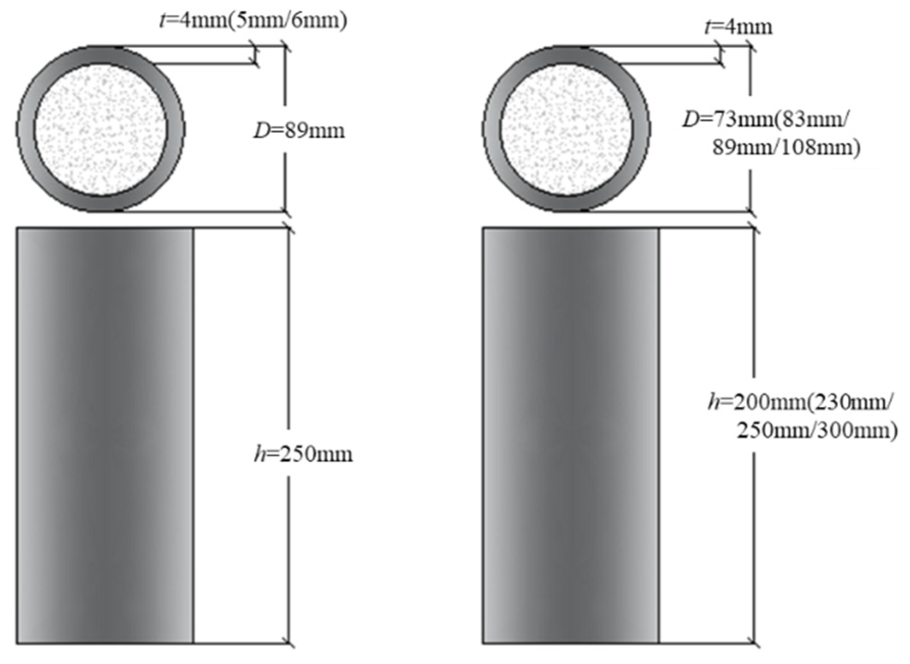 Although the aforementioned configurations each possess distinct advantages, current research has predominantly focused on the use of UHPC as an external encasement material, whereas investigations into its application as an infill material for steel tubes remain comparatively limited. Furthermore, although some scholars have investigated the effects of steel tube wall thickness and diameter on enhancing the load-bearing capacity of components [