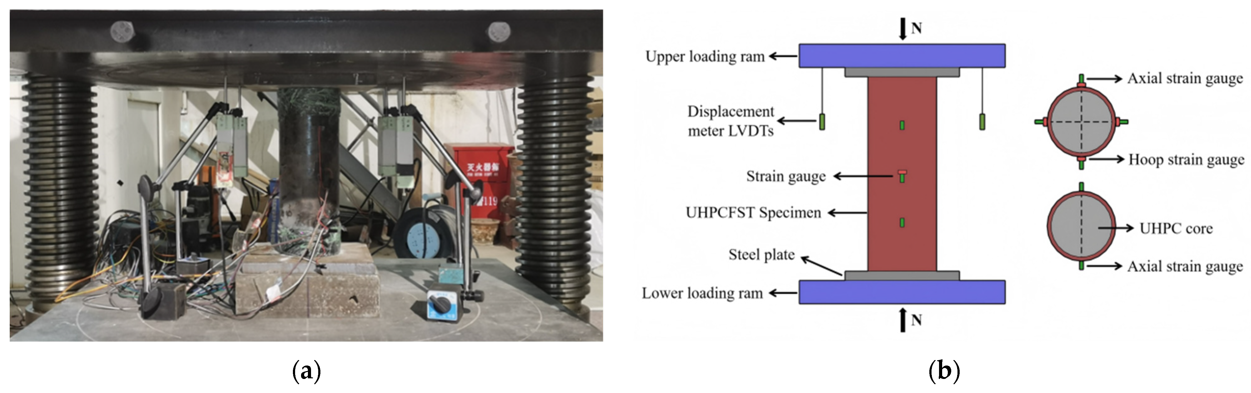 The research first conducts axial compression tests to obtain the stress–strain characteristics, failure modes, and confinement effects of the UHPCFST components. Subsequently, based on the experimentally calibrated material constitutive laws and interface parameters, a refined finite element model is established. This model is used to systematically analyze the full-range mechanical behavior, failure patterns, and the influence of parameters such as steel tube diameter, wall thickness, and UHPC strength under axial compression, thereby elucidating the mechanisms and controlling factors behind characteristic responses such as the “double-peak” phenomenon.