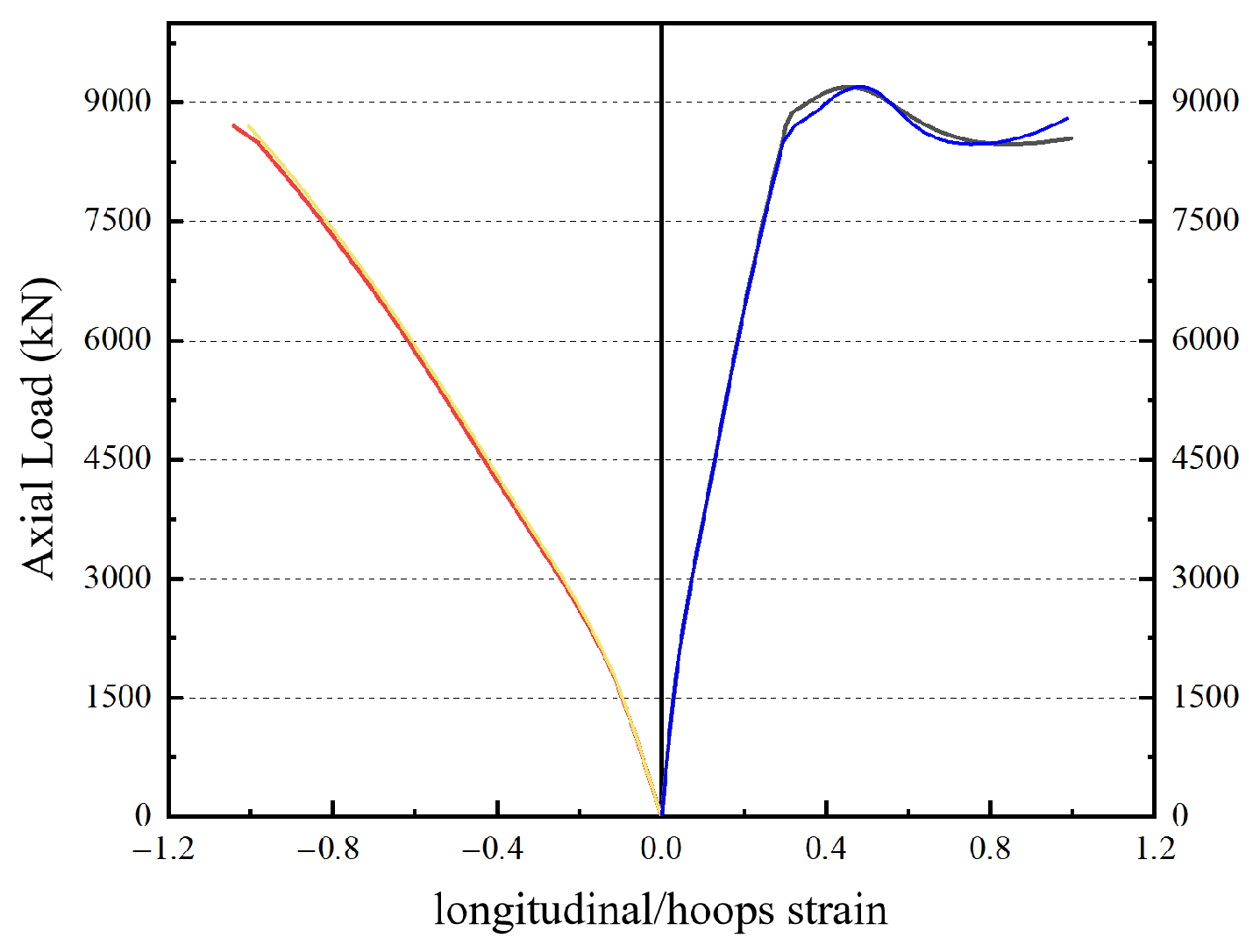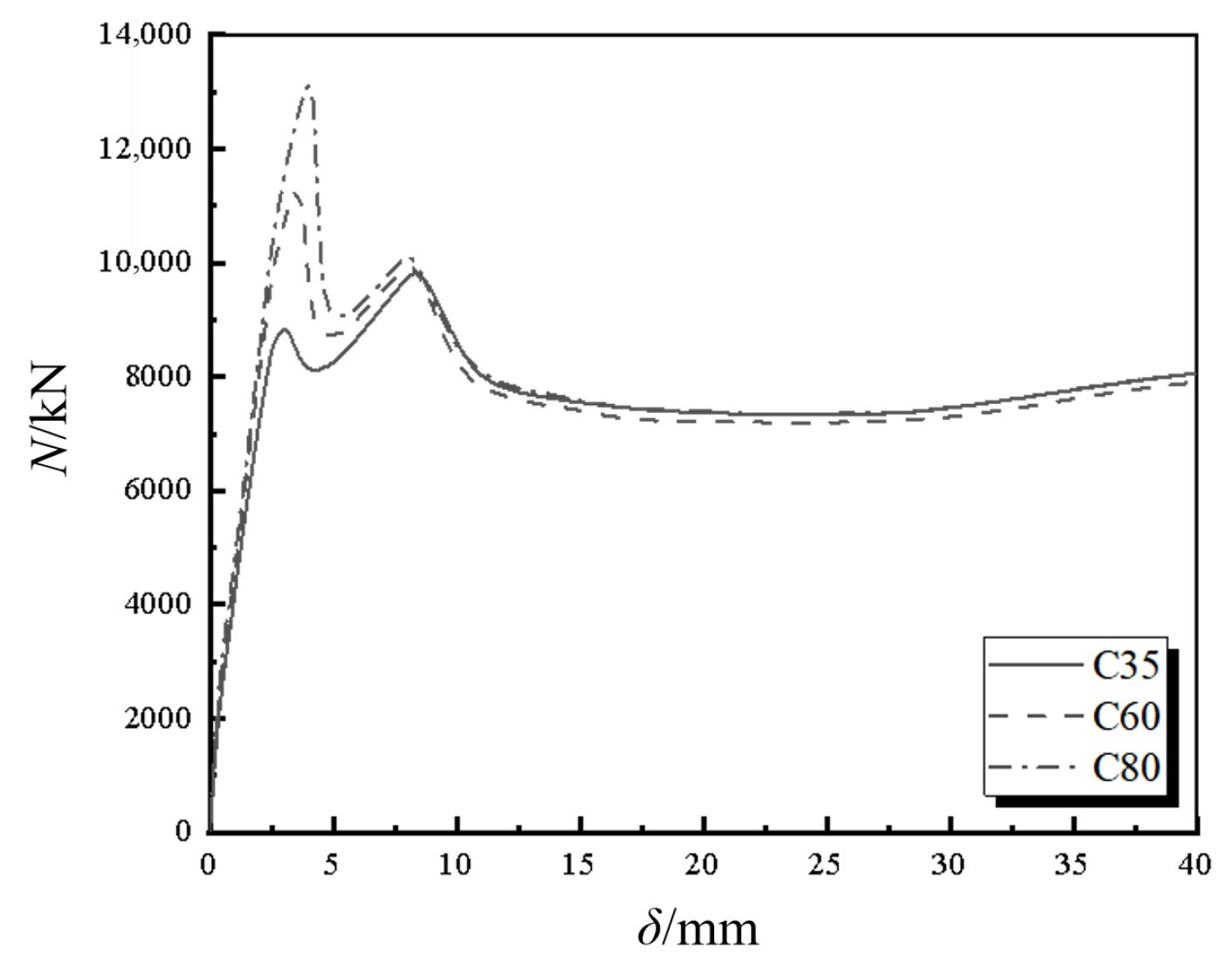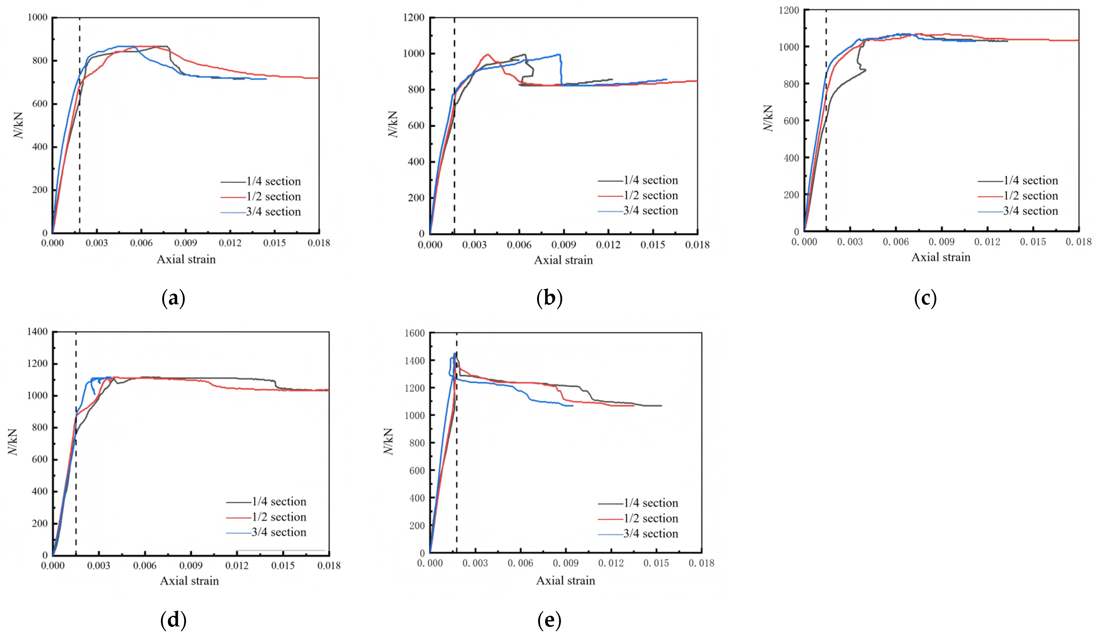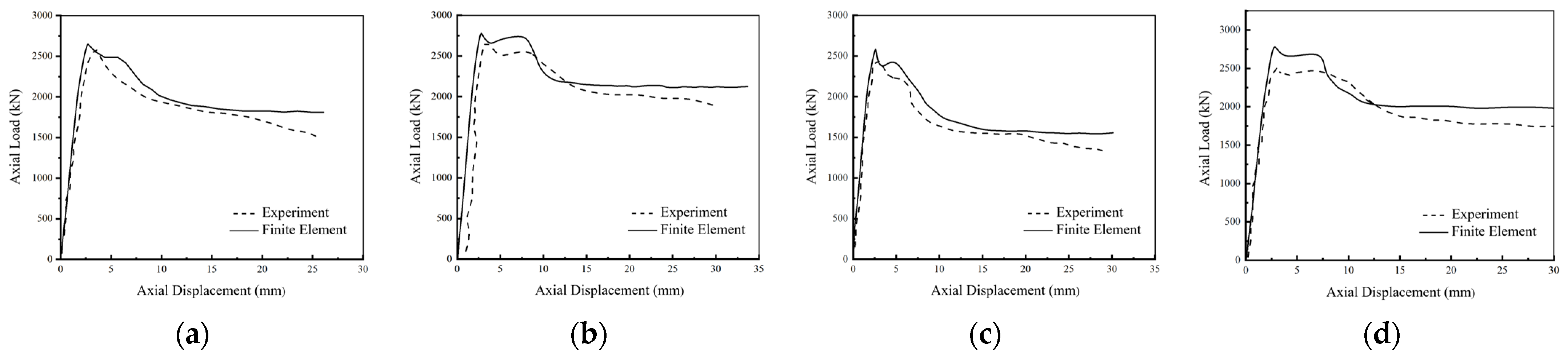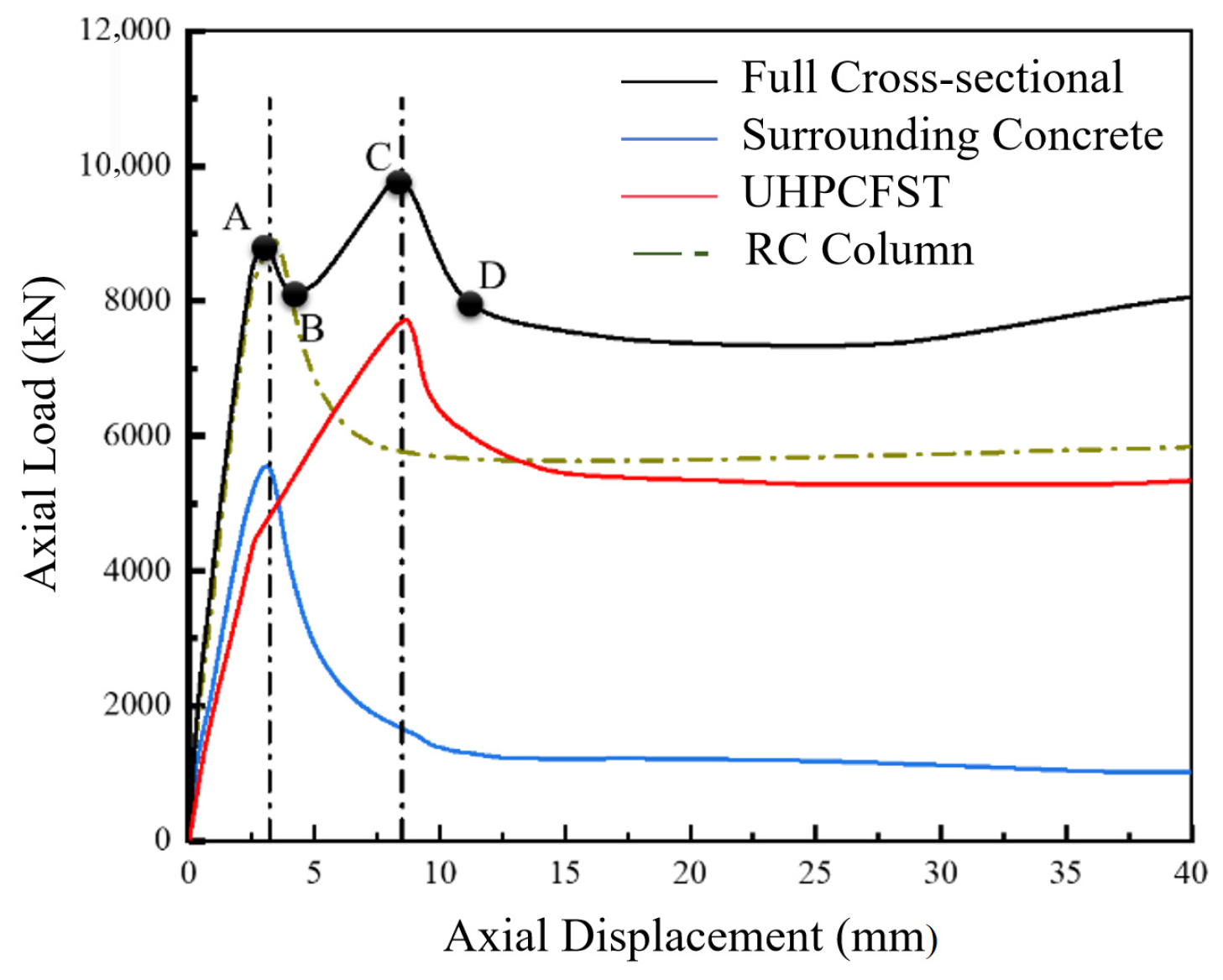 Secondly, it demonstrates a well-defined two-stage mechanical behavior. Under loading, the surrounding concrete reaches its peak stress and may crack first, while the internal UHPCFST continues to carry the load. This establishes a two-stage mechanical mechanism where the inner and outer materials sequentially mobilize their strength. This characteristic contributes to a potential “double-peak” load-deformation response for the composite column, which helps delay overall failure and improves energy dissipation capacity.
