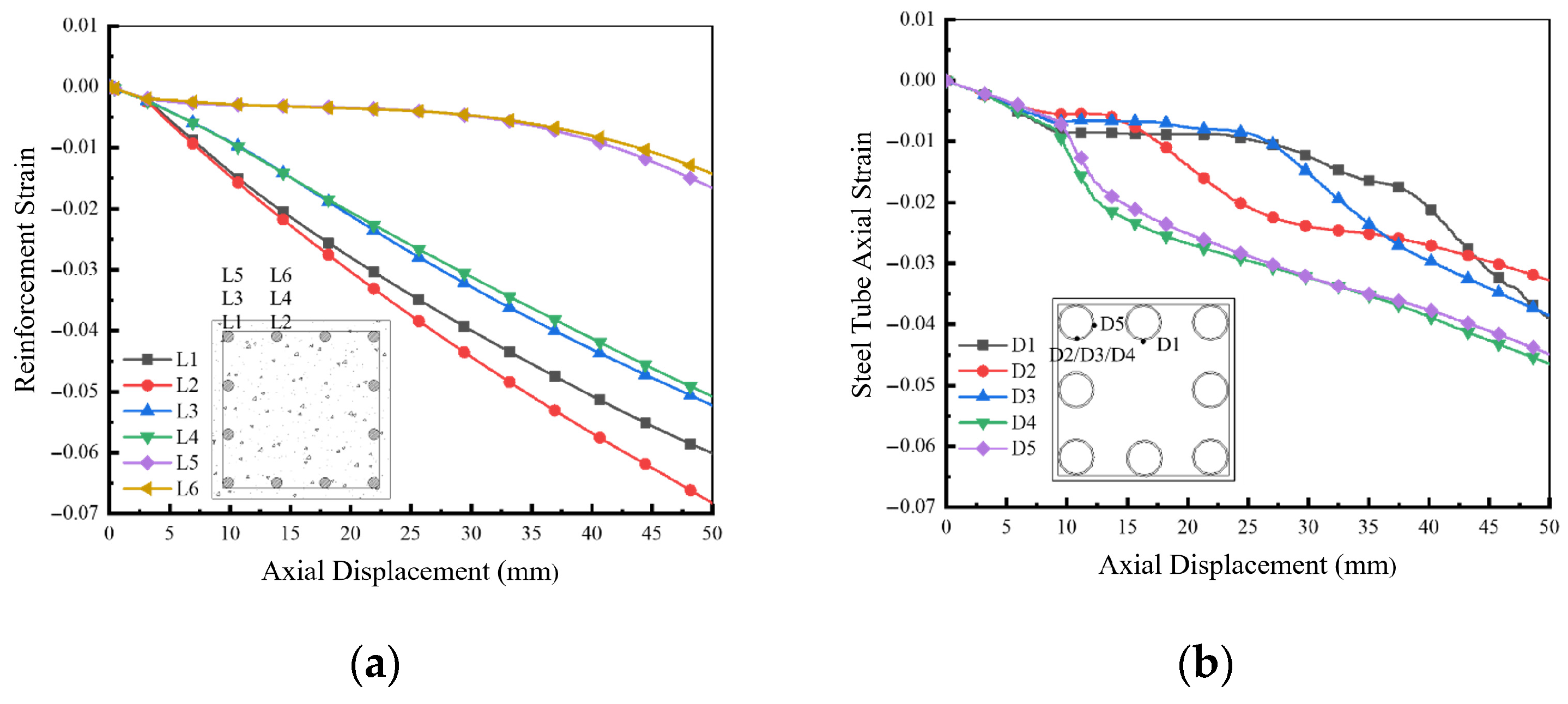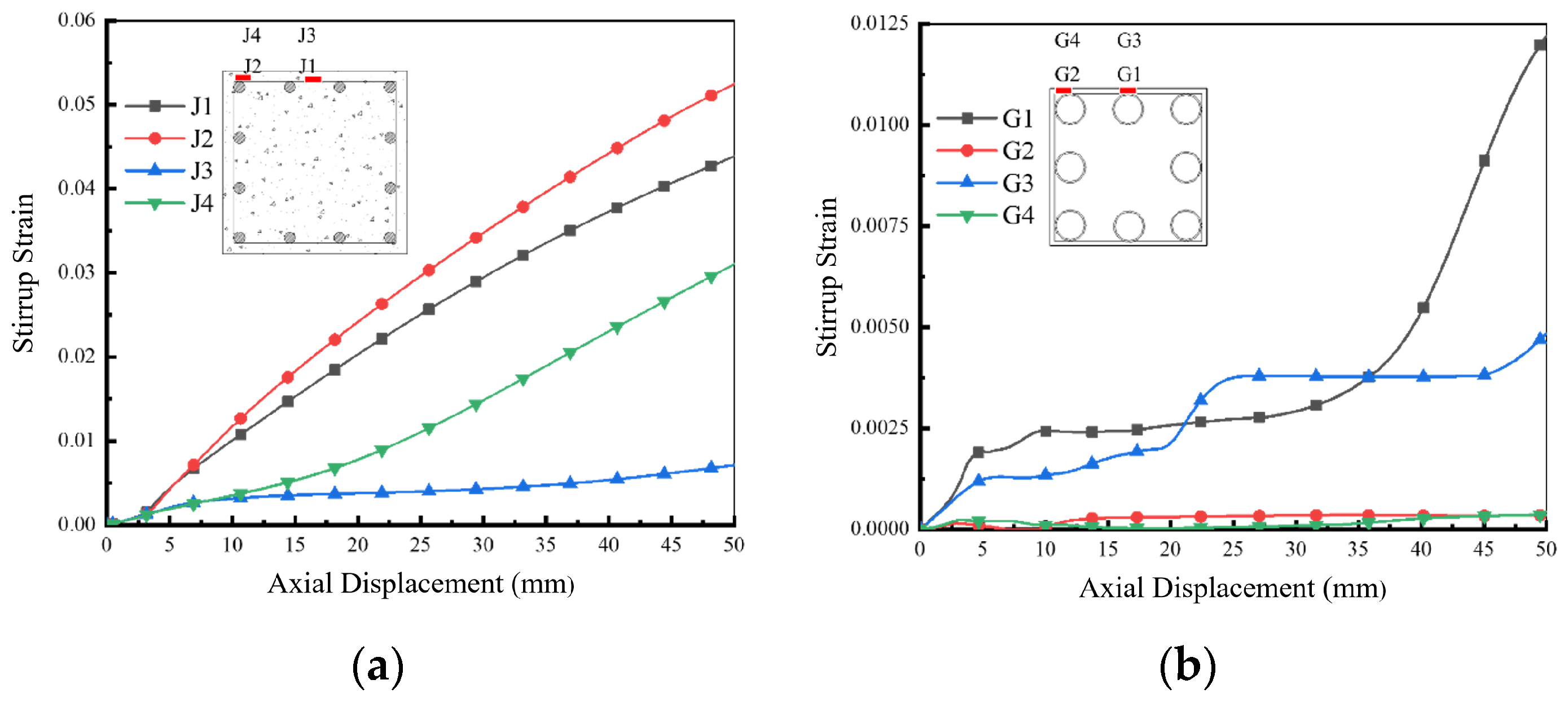 In RC columns, the longitudinal reinforcement exhibits non-uniform strain development across the section. In contrast, the longitudinal strain development in the steel tube of the composite column is generally slower and more uniformly distributed. The UHPCFST component can mitigate the lateral expansion effect of the concrete across the entire section while also sharing part of the lateral confinement role of the stirrups. This leads to differences in stirrup strain development throughout the loading process compared to traditional RC columns.