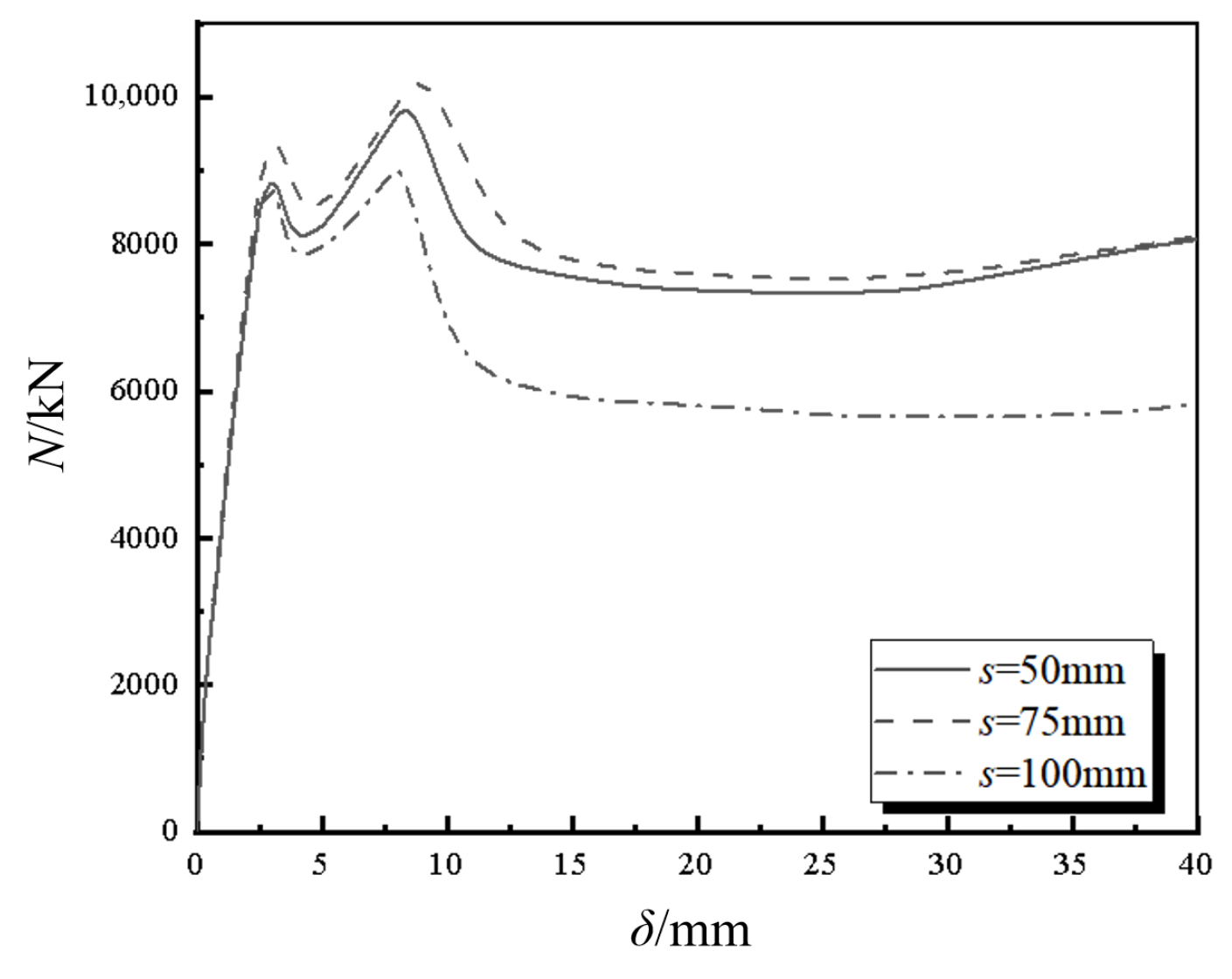 Compared to a traditional RC column with the same steel ratio, the peak bearing capacity of the composite column is increased by 10%, and the peak displacement is increased by 182%. Due to differences in the confinement effect on the concrete within the composite column, its load–displacement curve exhibits a secondary peak characteristic. The initial peak is contributed by both the surrounding concrete and the UHPCFST component, while the secondary peak is primarily sustained by the UHPCFST skeleton.
