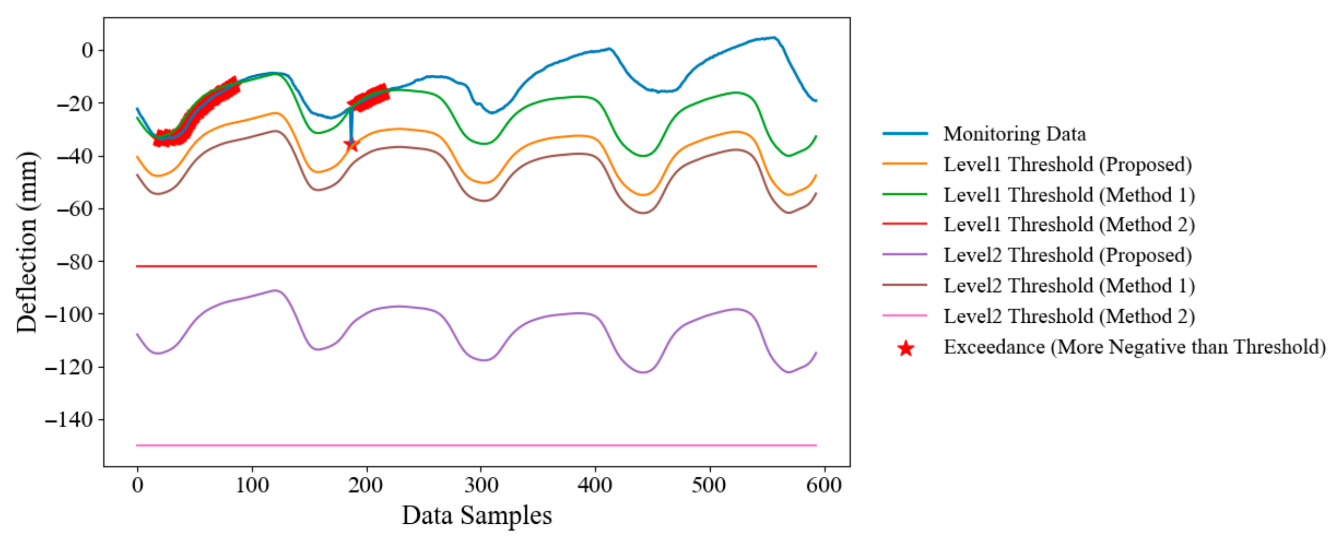 19] utilized an LSTM-based deep learning architecture to achieve accurate prediction of structural monitoring data and further realized dynamic early warning for bridge structural safety. Relying solely on deep learning models for early-warning threshold setting imposes stringent requirements on prediction accuracy, while the resulting thresholds often lack clear engineering meaning, interpretability, and controllability; moreover, the relatively narrow threshold intervals tend to cause frequent and potentially spurious warnings.