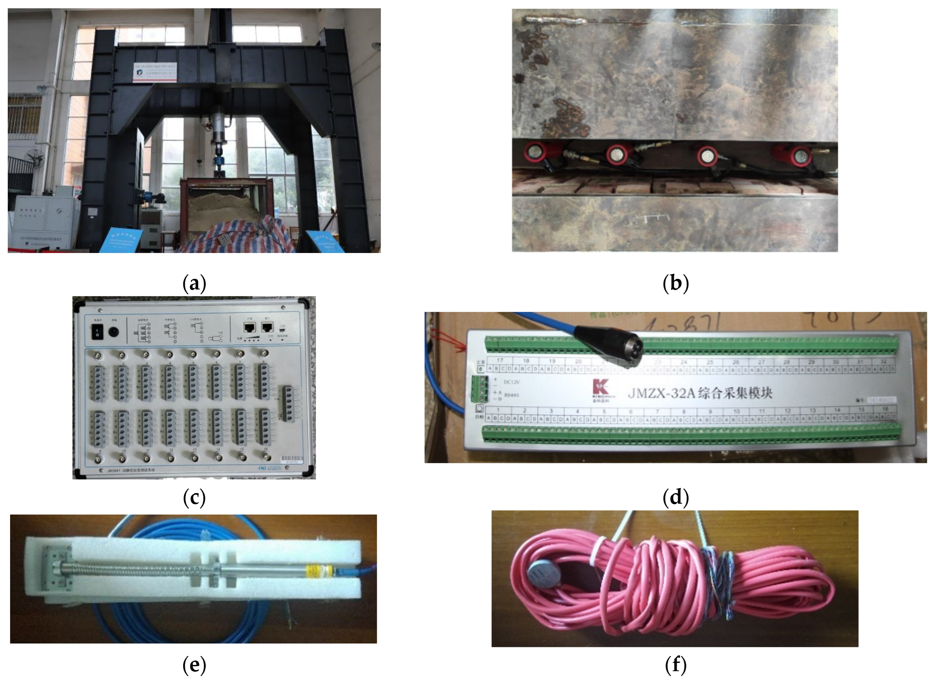 - Loading: After the sand filling is complete, the soil surface is leveled, and loading is then initiated. A stepwise loading method is adopted, using the settlement stabilization approach—the next load level is applied only after the previous load has reached a stable state. A DJM-500 biaxial electro-hydraulic servo loading system is used to apply the vertical load.