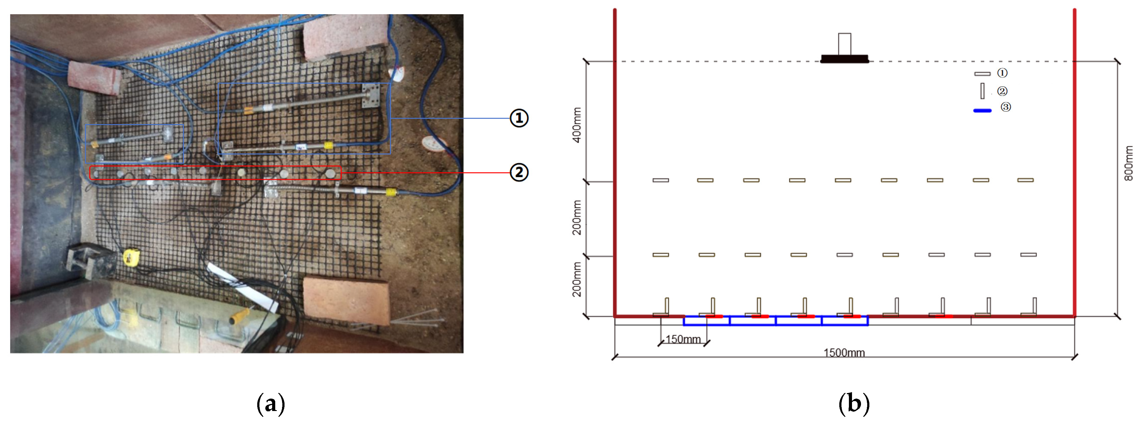 - Layout of test elements and geogrid installation: In order to reduce test error and simulate the actual state of the geogrid in the sand, a 20 mm thick layer of sand is first backfilled and compacted with a flat plate tamper before laying the geogrid. During the filling process, when reaching the preset height and position for placing the measurement elements, the surface is first leveled with a flat plate tamper, then a groove 20 mm deep is dug to embed the measurement elements, in order to minimize errors caused by manual operations. The layout of the monitoring elements and the overall arrangement are shown in Figure 4.