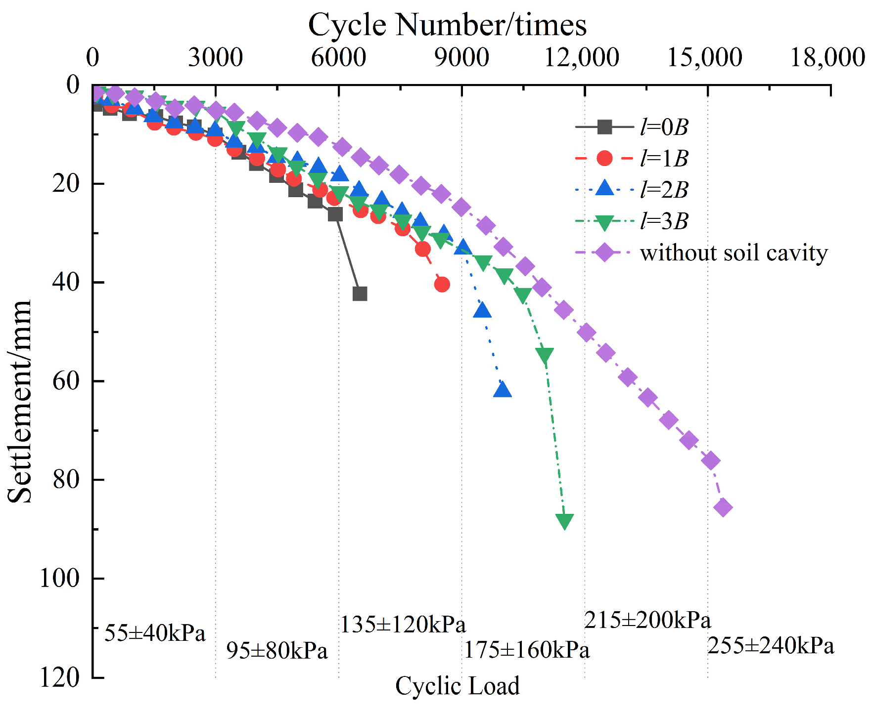 - Under the same cyclic load and the same number of cycles (3000 cycles), the settlement rate is the fastest when l = 0B, and the slowest when there is no soil cavity.