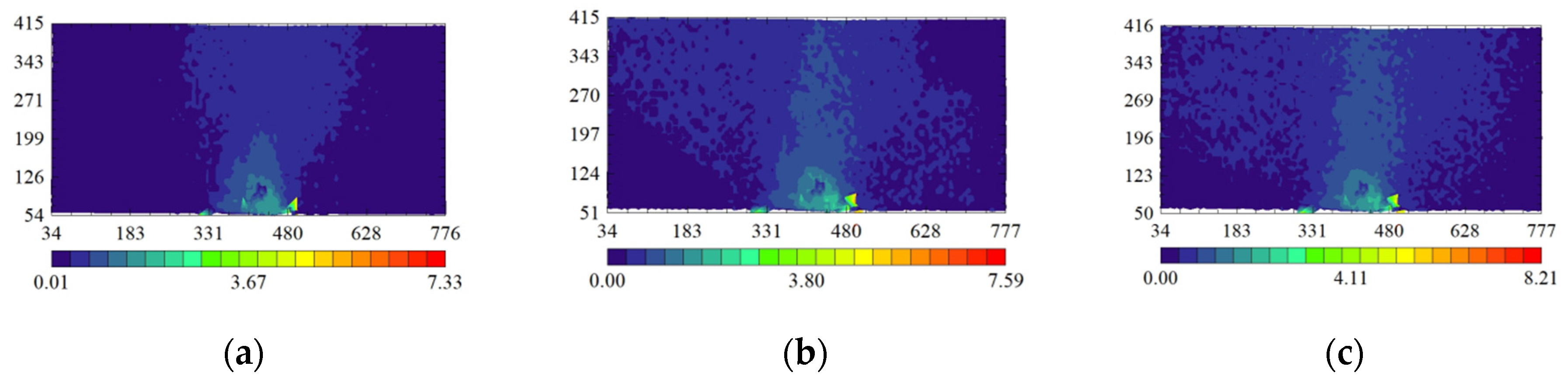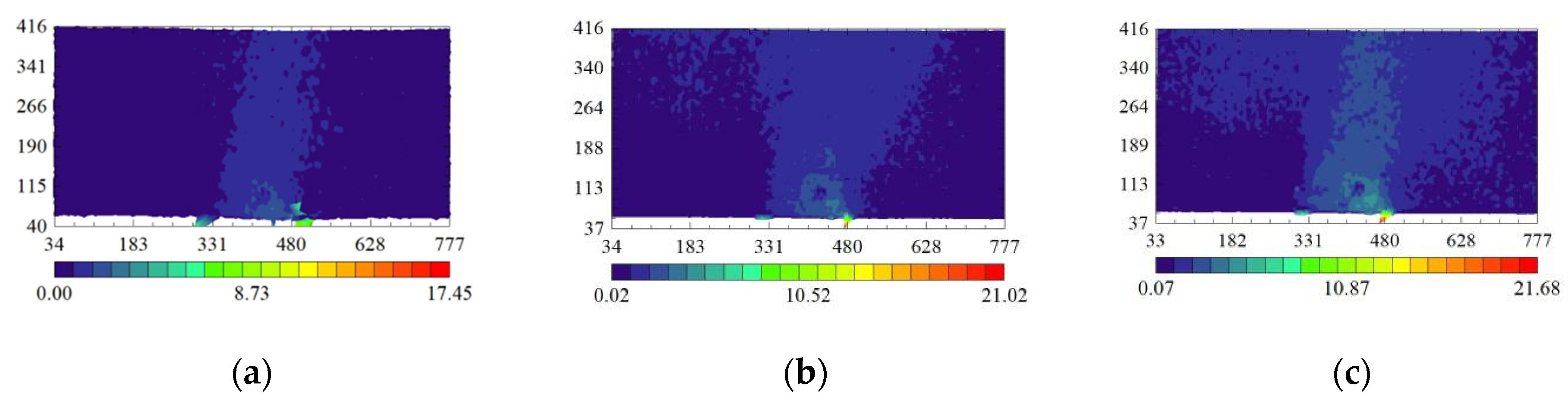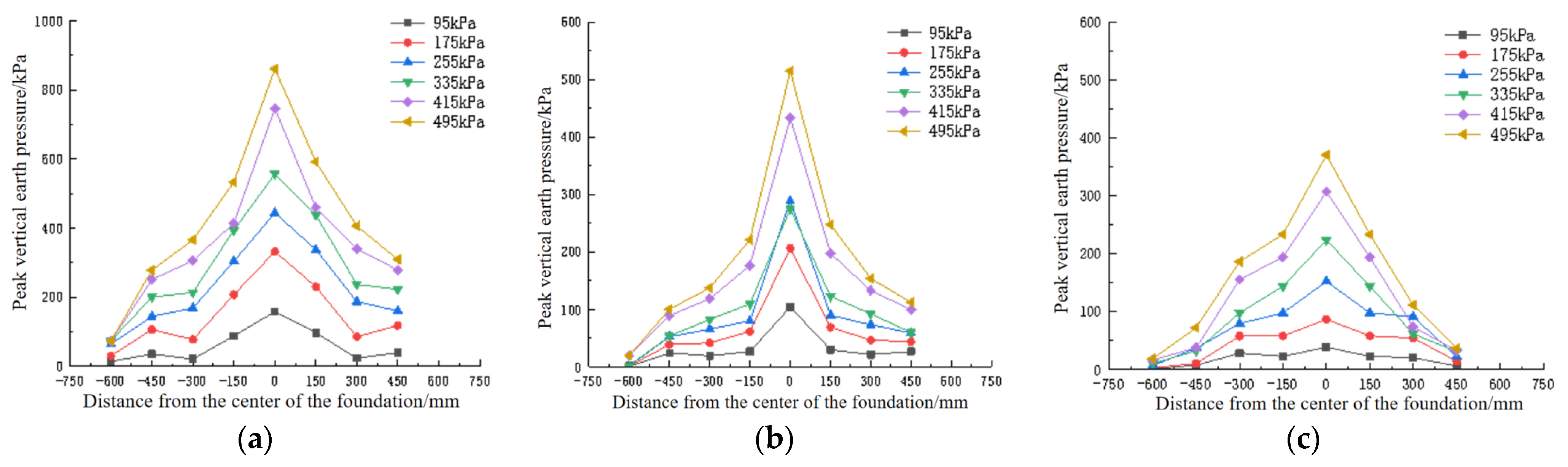 - When the soil cavity is not located directly beneath the foundation center, the ranges of the soil arches on either side of the cavity are not equal, and the difference in range decreases as the load increases. For instance, in Figure 15a, the horizontal distances from the outer arch foot to the middle arch foot are 37.25 mm on one side and 6.21 mm on the other.