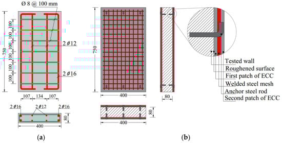 All RC walls had identical dimensions with a height (h) of 750 mm and a width (b) of 400 mm, with a thickness (t) of 80 mm as shown in Figure 1. The reinforcement arrangement of the steel reinforcements (vertical and lateral) ensures the structural integrity of the RC wall. The adopted reinforcement layout was chosen to ensure stable and controlled failure mechanisms. All walls were reinforced with vertical and horizontal reinforcement as shown in Figure 1a. The vertical reinforcement consisted of two bars with a diameter of 16 mm located at each of the two small sides along with two bars with 12 mm located at each large side. It should be noted that the diameter of the corner bars was deliberately designed to be large compared to the specimen thickness to avoid premature yielding of longitudinal reinforcement. All the specimens had sufficient cover concrete to tackle durability issues of concrete, and no adverse effects related to bar congestion or cover splitting were observed during experiment. The horizontal reinforcement consists of deformed bars with 8 mm diameter provided with standard 135° end hooks, in accordance with conventional confinement and anchorage requirements, with 100 mm spacing along the height of the wall shown in Figure 1a.
