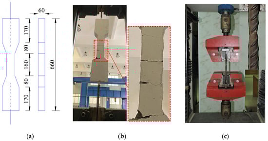 Direct tensile tests: (a) dimensions, (b) ECC, and (c) steel bar.