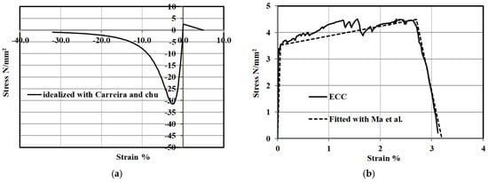 For each concrete type, three cylinders of 150 mm × 300 mm were tested to obtain the compressive strength of concrete (fc′) in accordance with ASTM C39/C39M [38]. Uniaxial tensile tests were carried out to measure the tensile strength of concrete as shown in Figure 2. The compressive strength of NC and ECC was 32 MPa and 67 MPa, respectively. Figure 3a,c presents the compressive stress–strain relationship for the two types of concrete along with the simplified curves used for the numerical modeling. The tensile stress–strain relationship of NC and ECC is shown in Figure 3. The tensile strength of NC and ECC was 3 and 4.5 MPa, respectively.